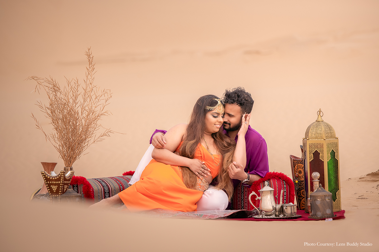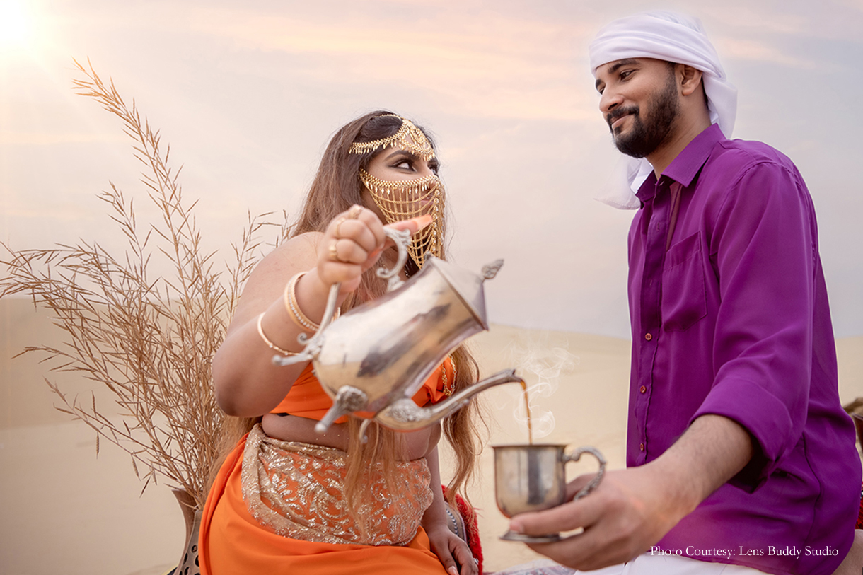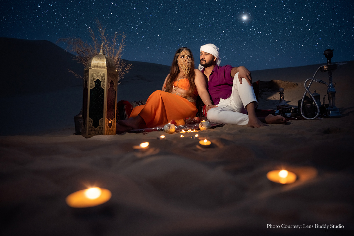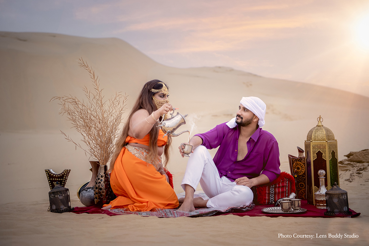The pristine canvas of the desert offered an enchanting backdrop to the couple’s interactions as they immortalized their bond. The vivid choice of color for the ensembles made for entirely different yet striking moods against the day and night sky, while the bedouin-style setup with lamps, rugs, teapots, and more lent an alluring vibe to the shoot concept.