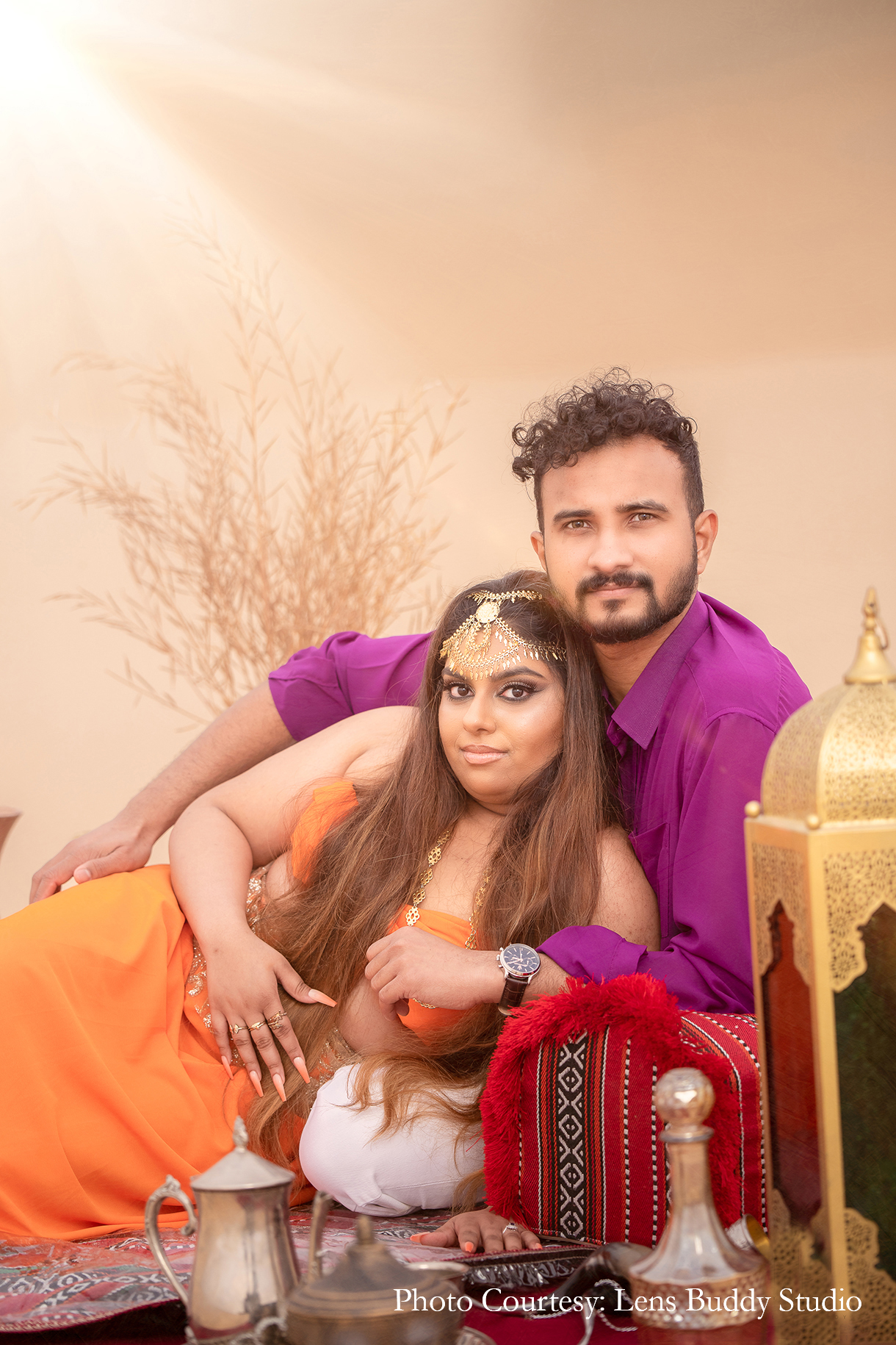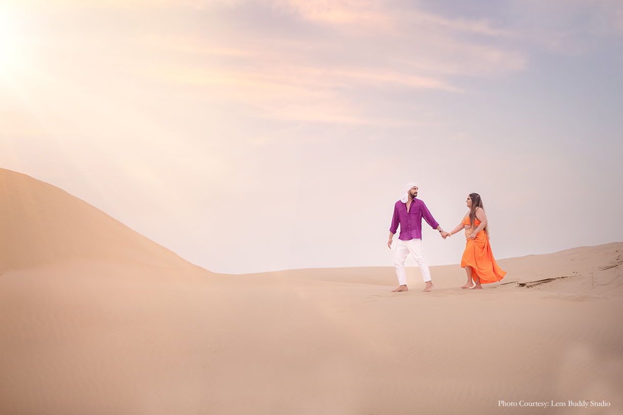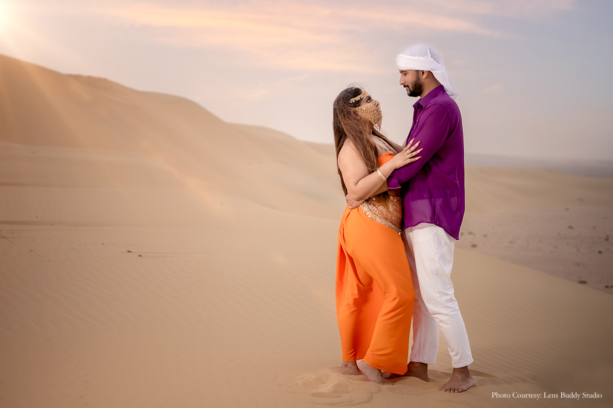 The pristine canvas of the desert offered an enchanting backdrop to the couple’s interactions as they immortalized their bond. The vivid choice of color for the ensembles made for entirely different yet striking moods against the day and night sky, while the bedouin-style setup with lamps, rugs, teapots, and more lent an alluring vibe to the shoot concept.