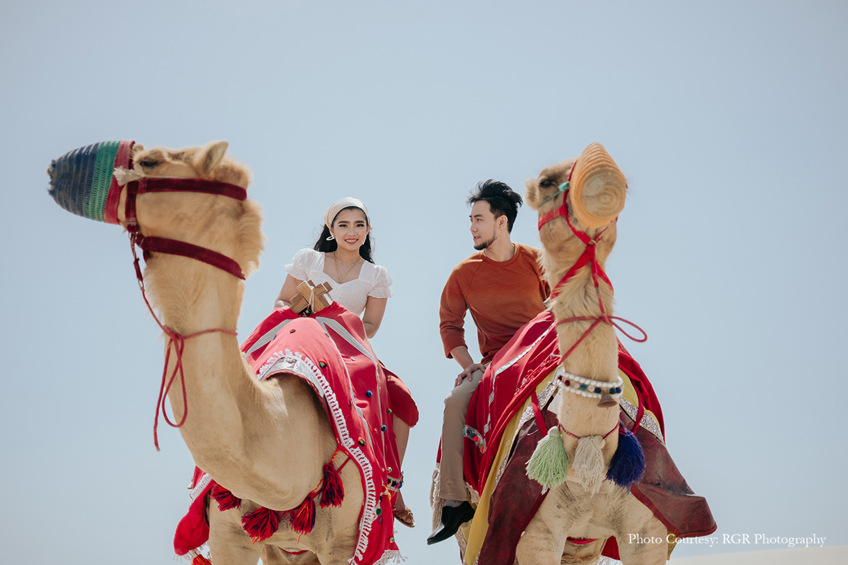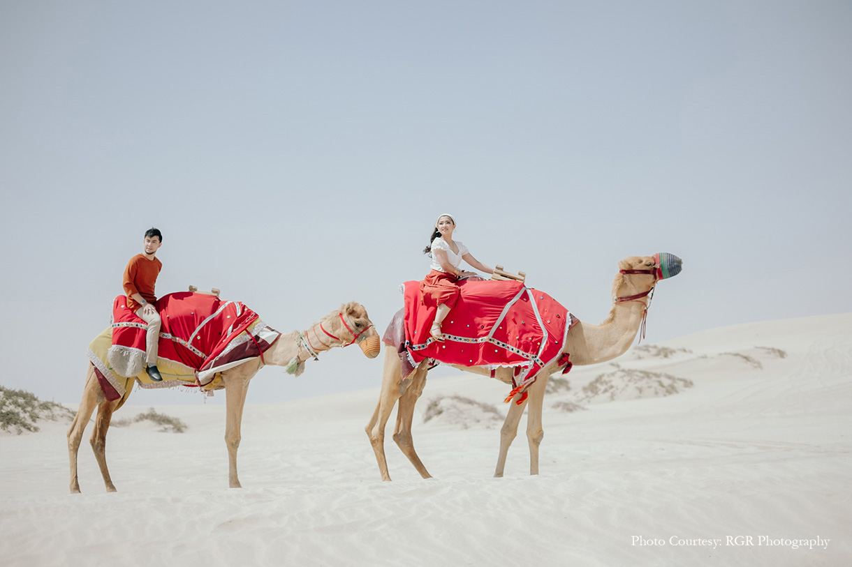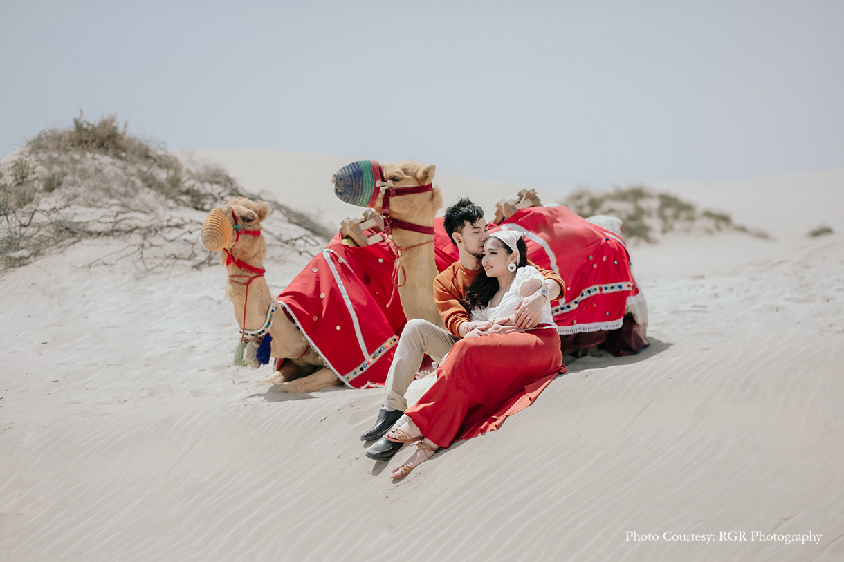 Shot by RGR Photography at the Inland Sea, an iconic location emblematic of Qatar’s unblemished beauty, the photoshoot captures the layered nuances of their bond. From playful candids where the couple’s vivacious personalities were revealed for the lenses to artistic portraits where they gazed into each other’s eyes, each picture expressed a plethora of emotions.