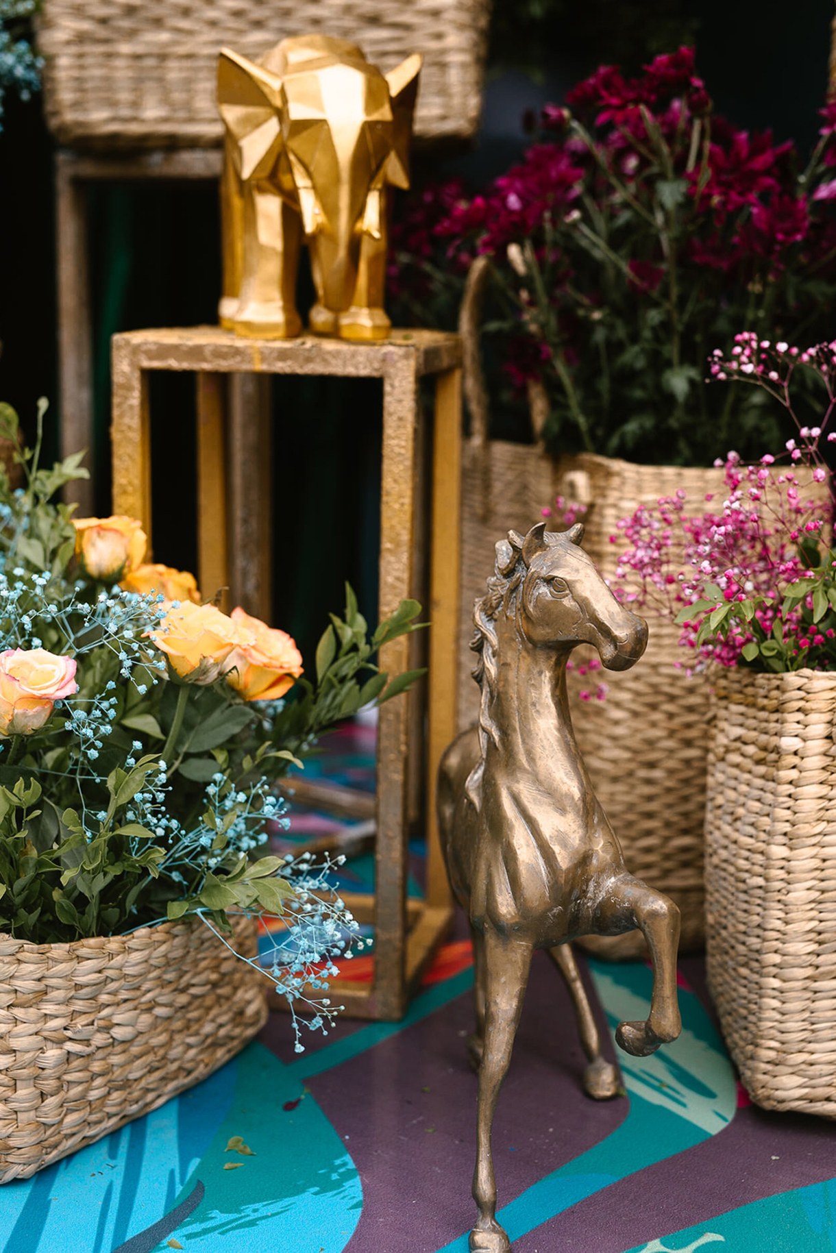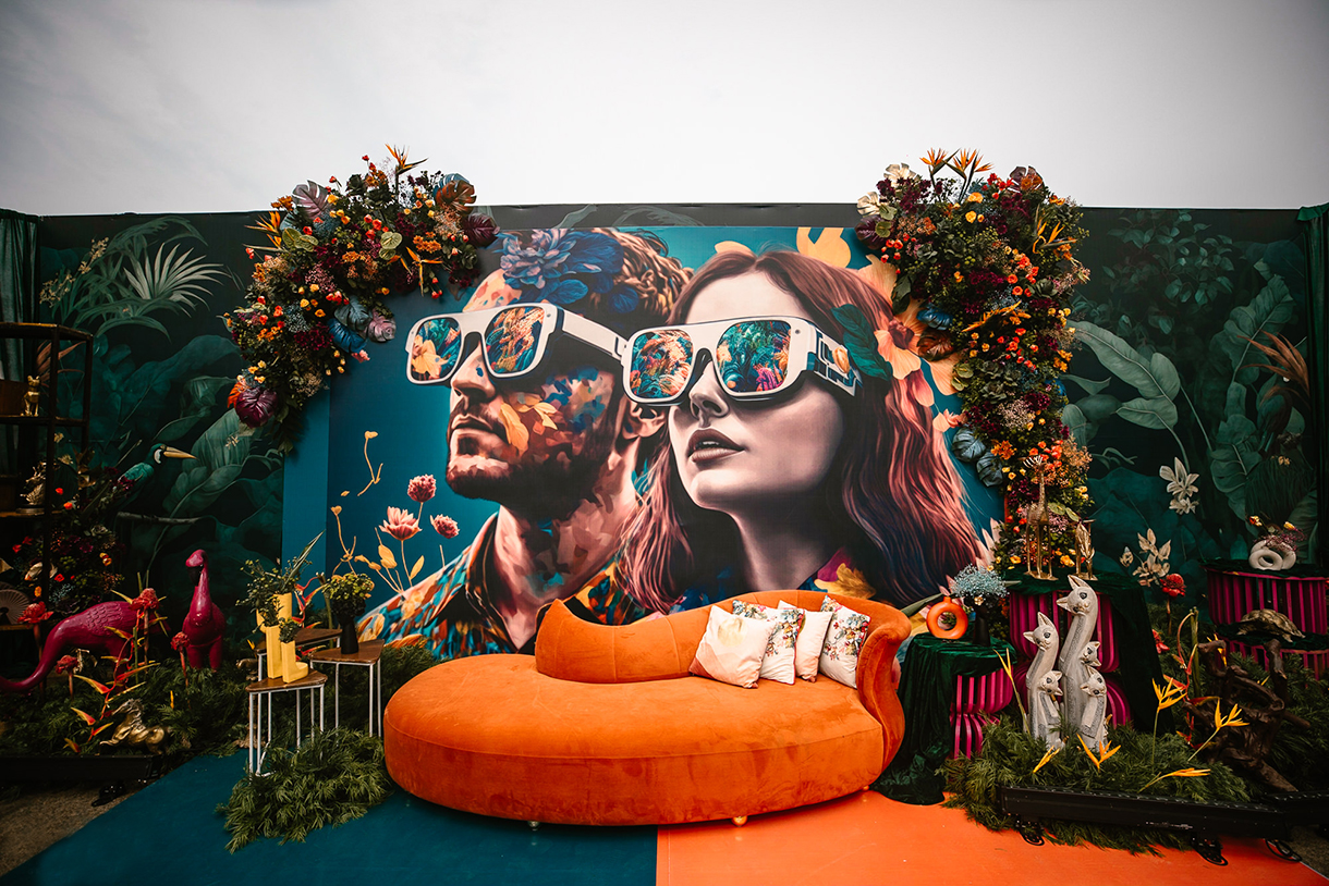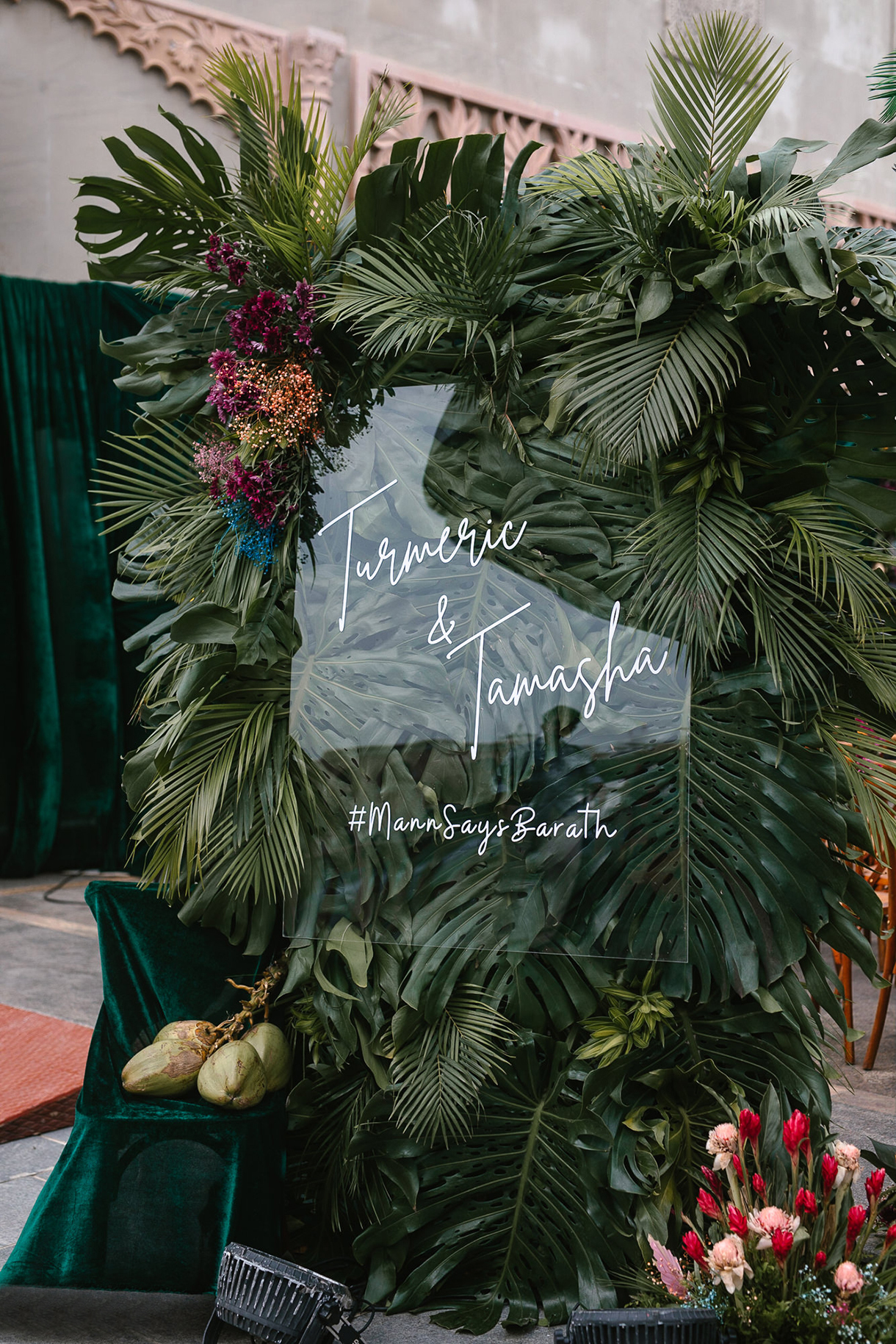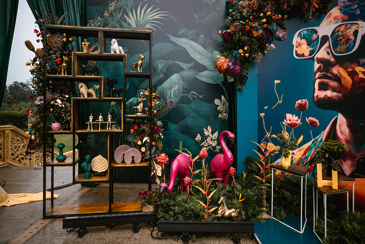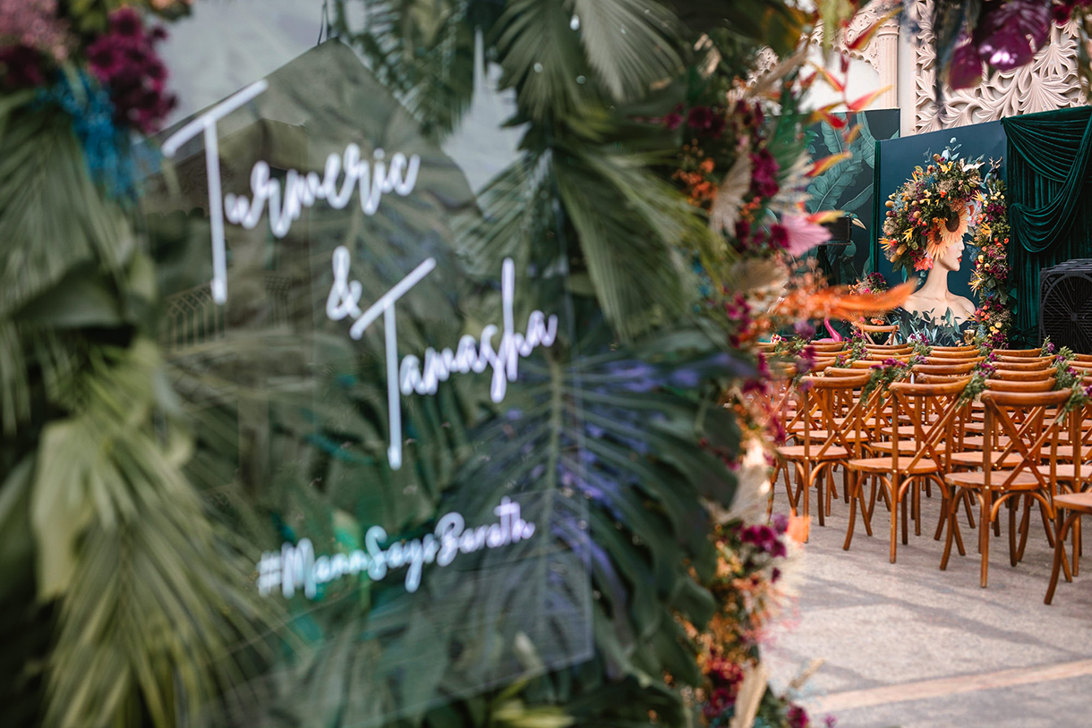 Sowmya shares, “The tropical Haldi with a twist started about with a basic idea of avoiding the typical and then taking it up a notch by making it completely quirky! The couple’s sketch in the back and the colour palette really brought about a fun element. The pop-art figures of the lady and her hair carrying some vibrant floral work was also a hit! The cross-back chairs gave a final finishing touch to the tropical look.