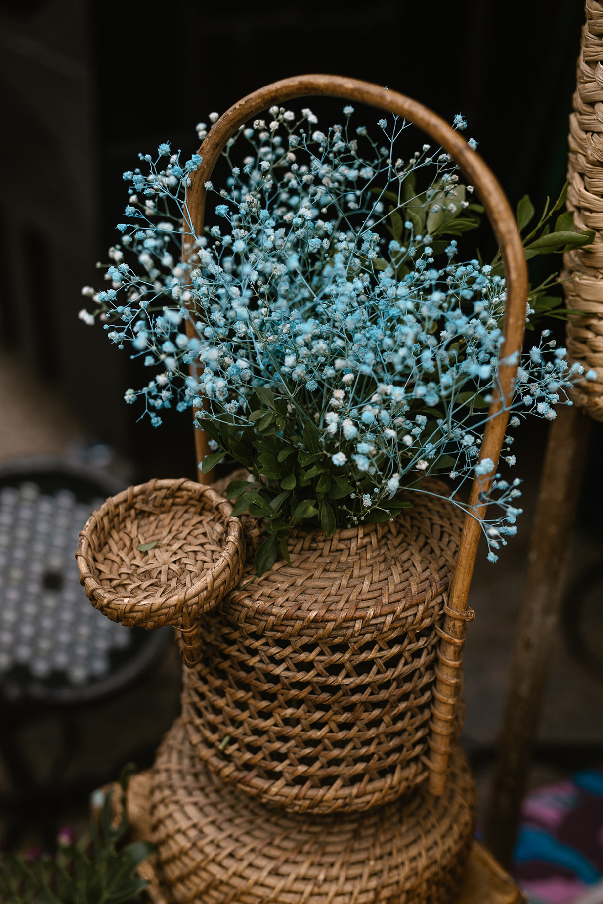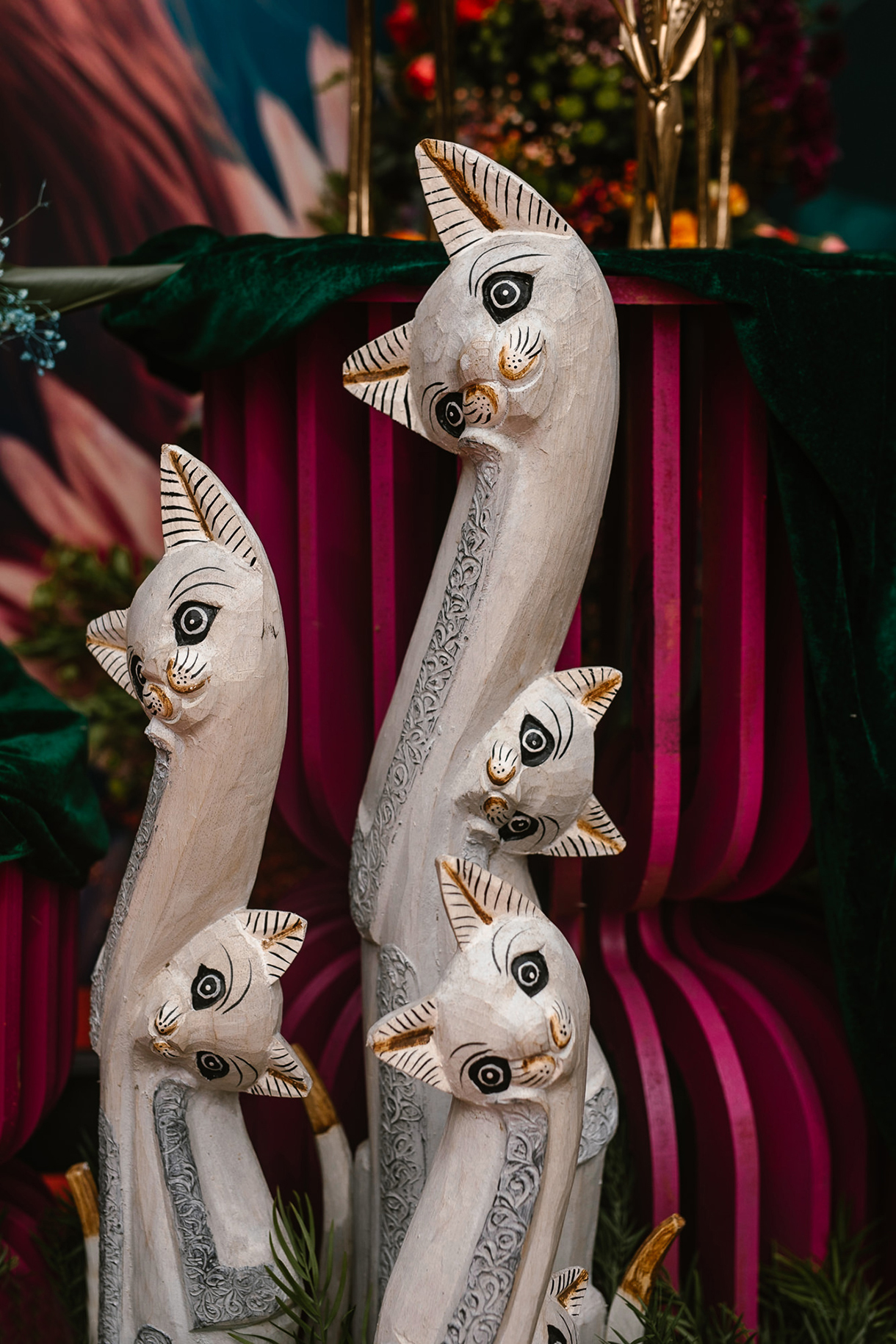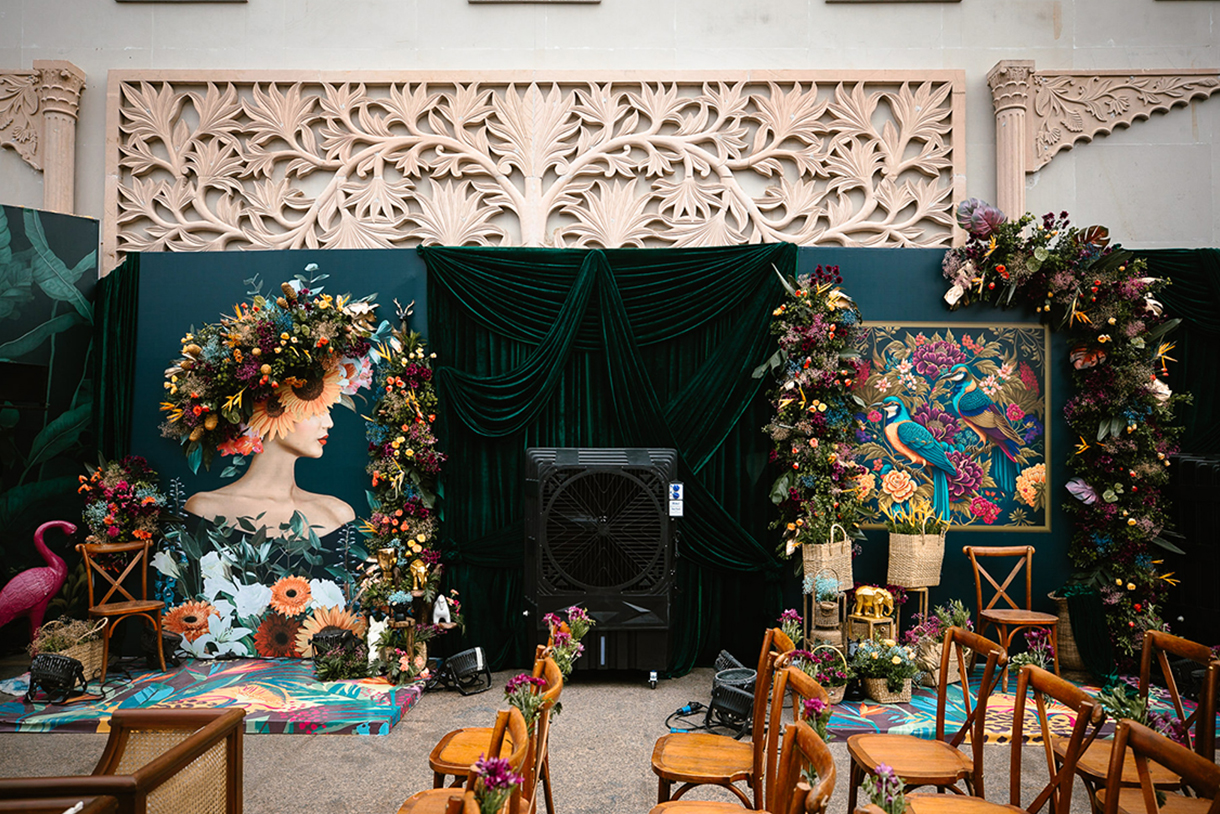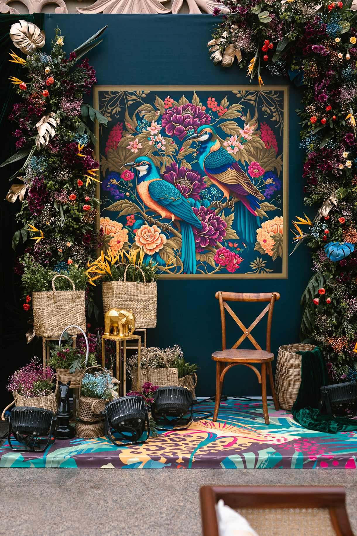 Sowmya shares, “The tropical Haldi with a twist started about with a basic idea of avoiding the typical and then taking it up a notch by making it completely quirky! The couple’s sketch in the back and the colour palette really brought about a fun element. The pop-art figures of the lady and her hair carrying some vibrant floral work was also a hit! The cross-back chairs gave a final finishing touch to the tropical look.