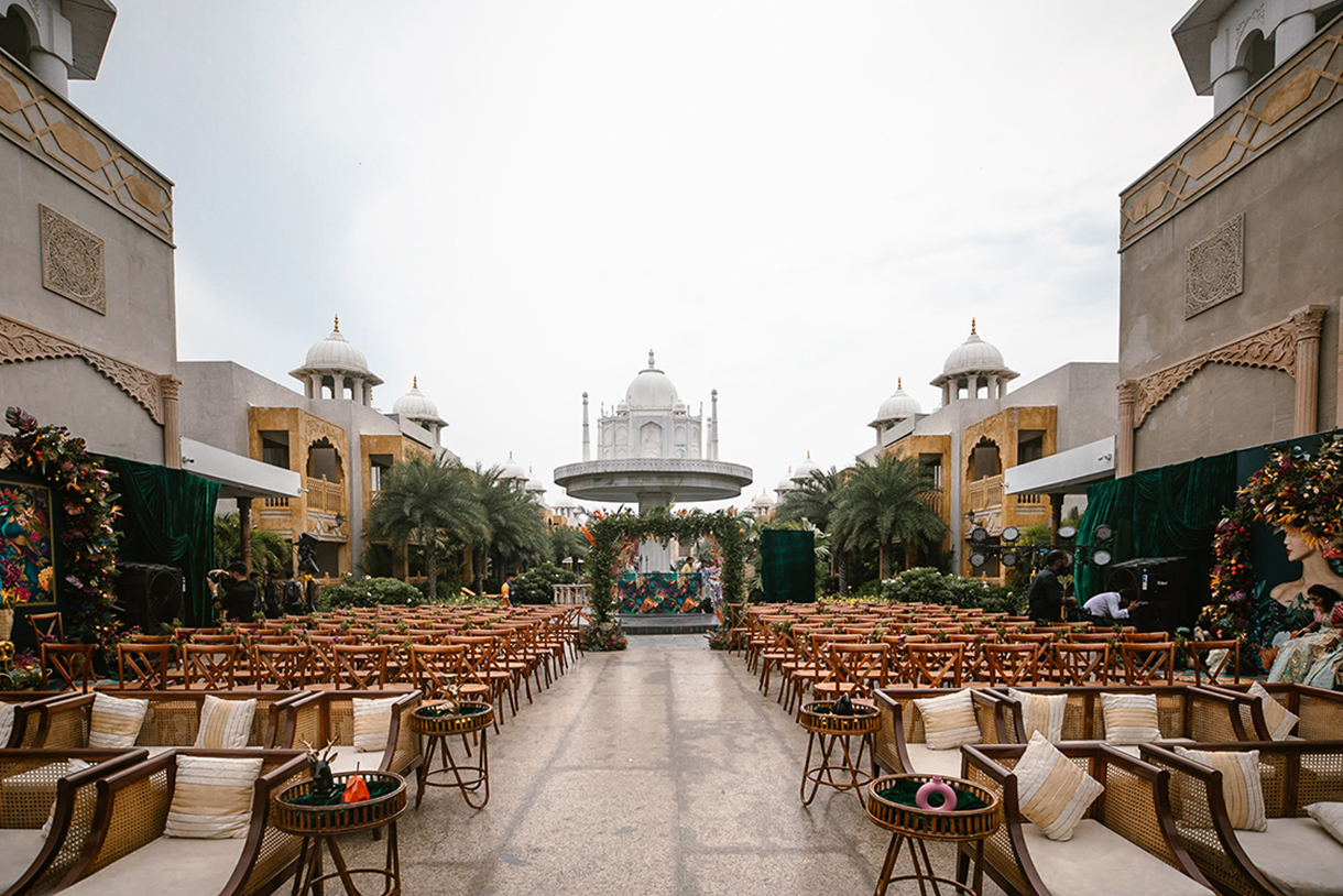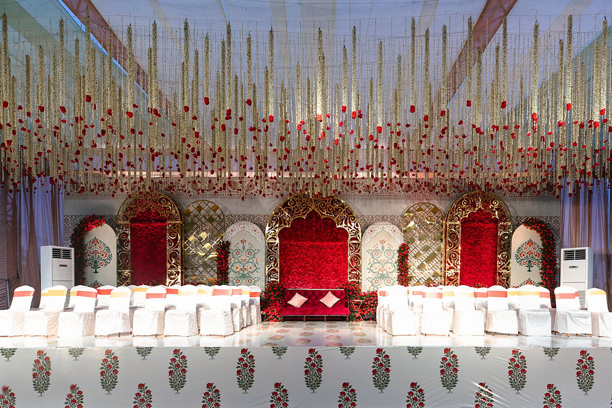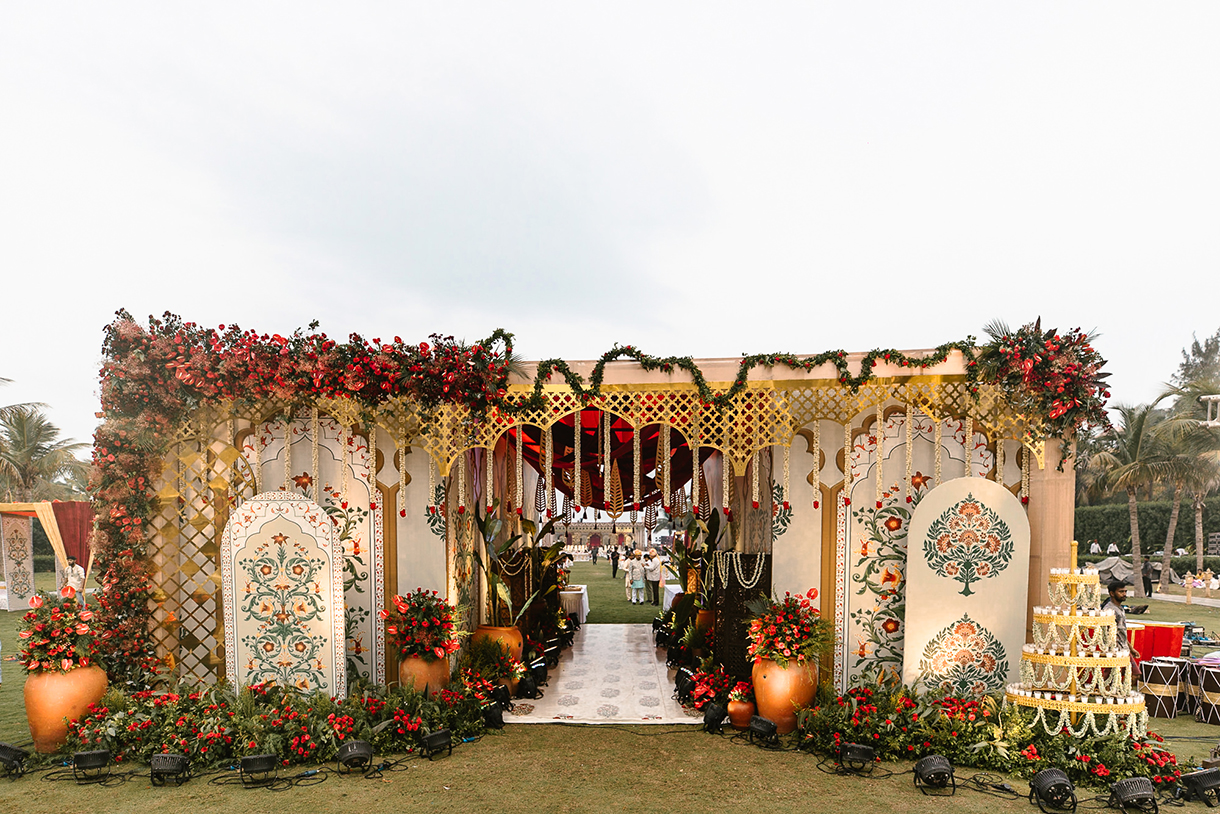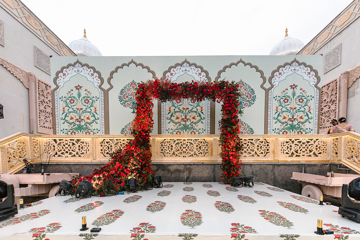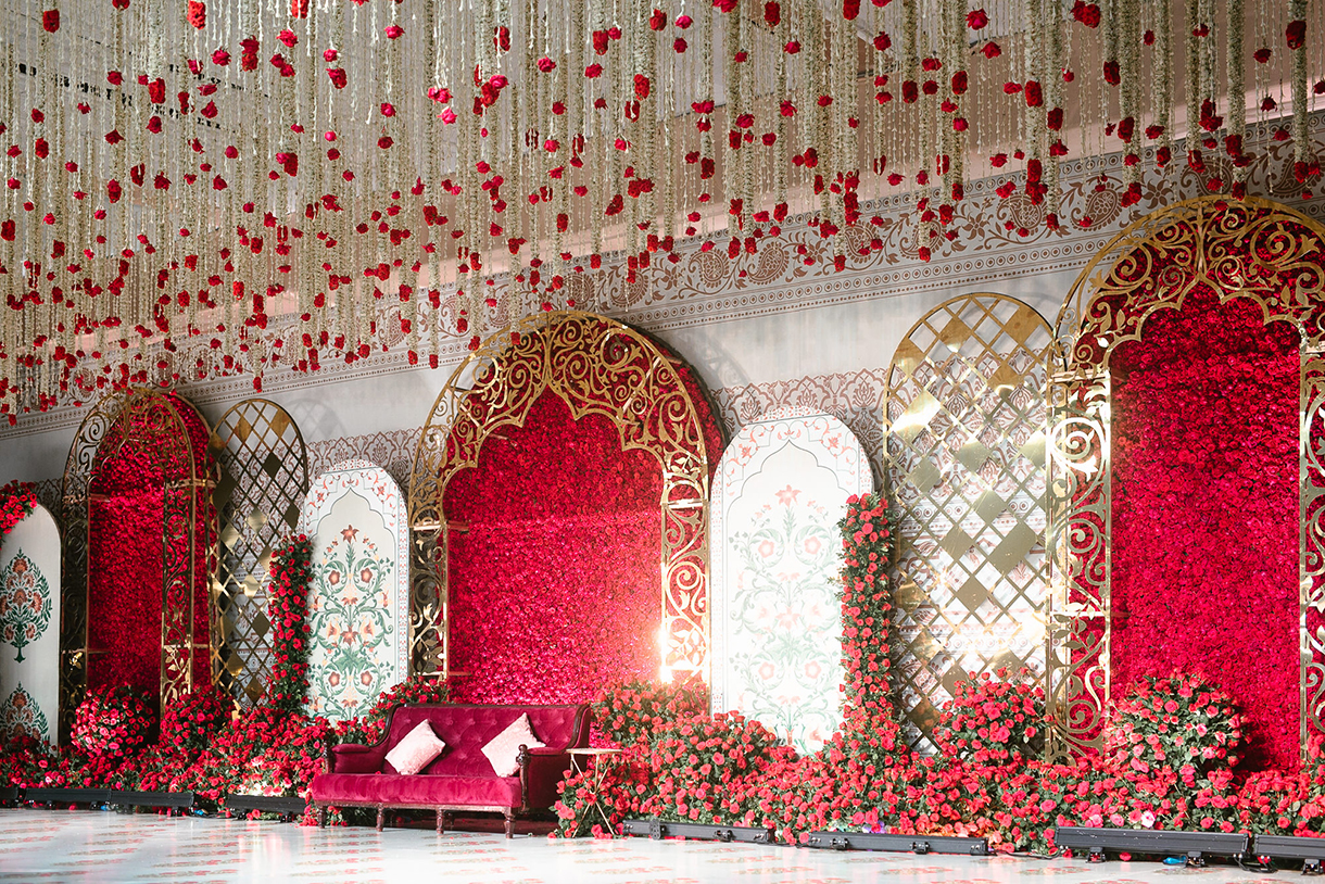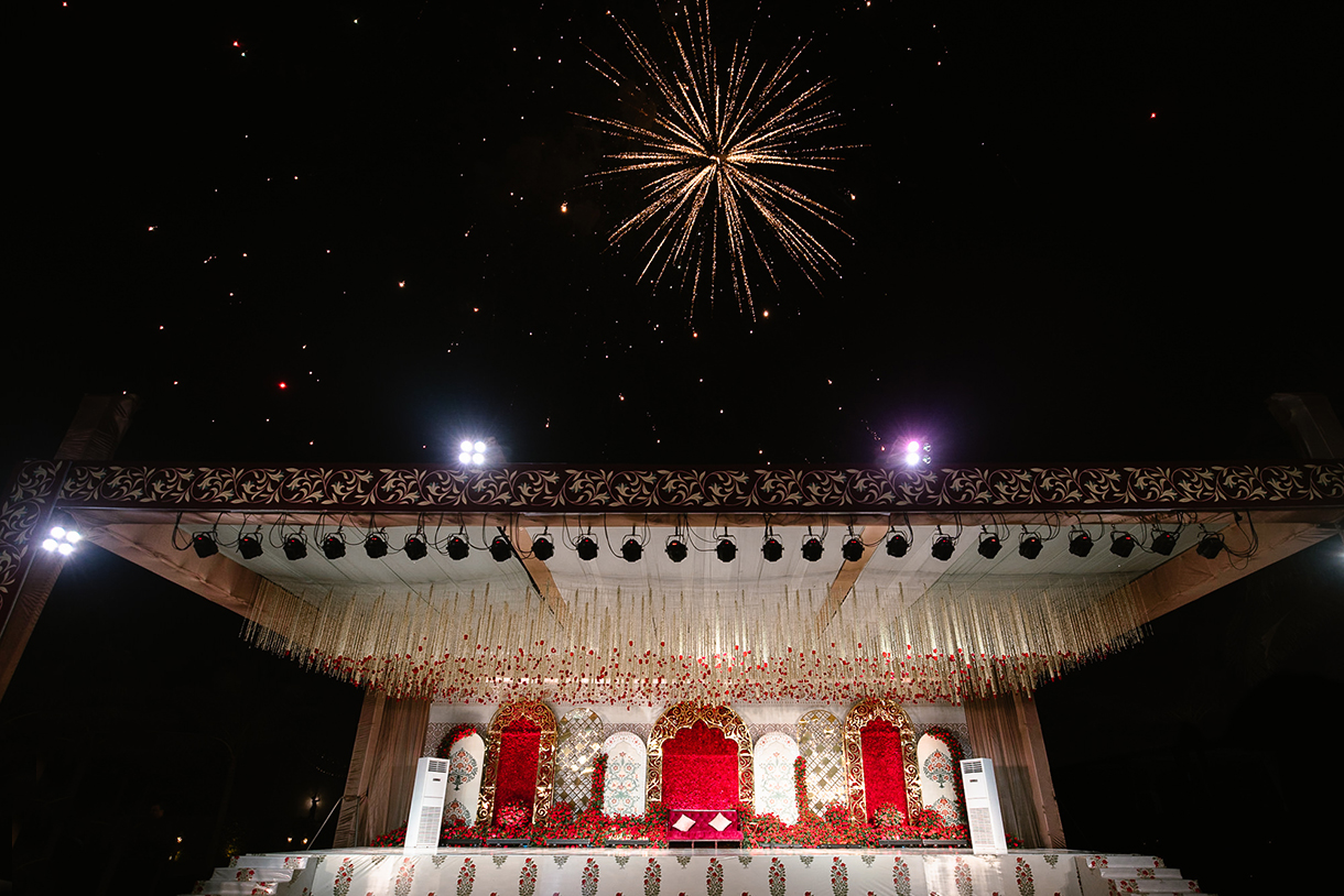 Sowmya shares, “Doing justice to the palatial beauty of the property, we dove into the Mughlai prints and structures for this event. The grand staircase had a setup for the varmala that acted as the best location to have a grand seventy-member dance number to welcome the bride and groom to the main stage! The magnificent stage that spanned fifty feet its glorious arch and the ceiling filled with fragrant Rajnigandha flowers marked the last event for the wedding festivities.”