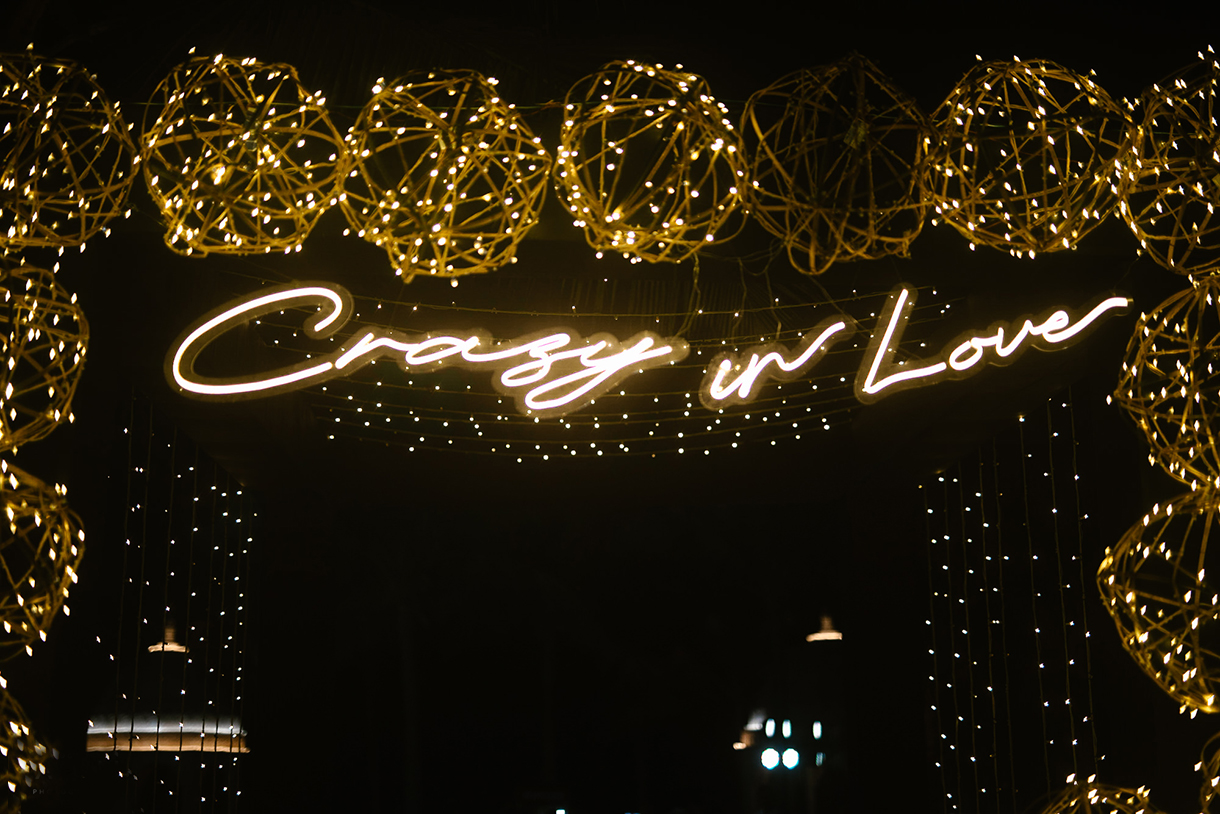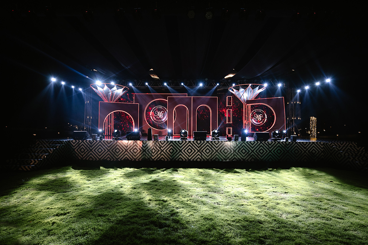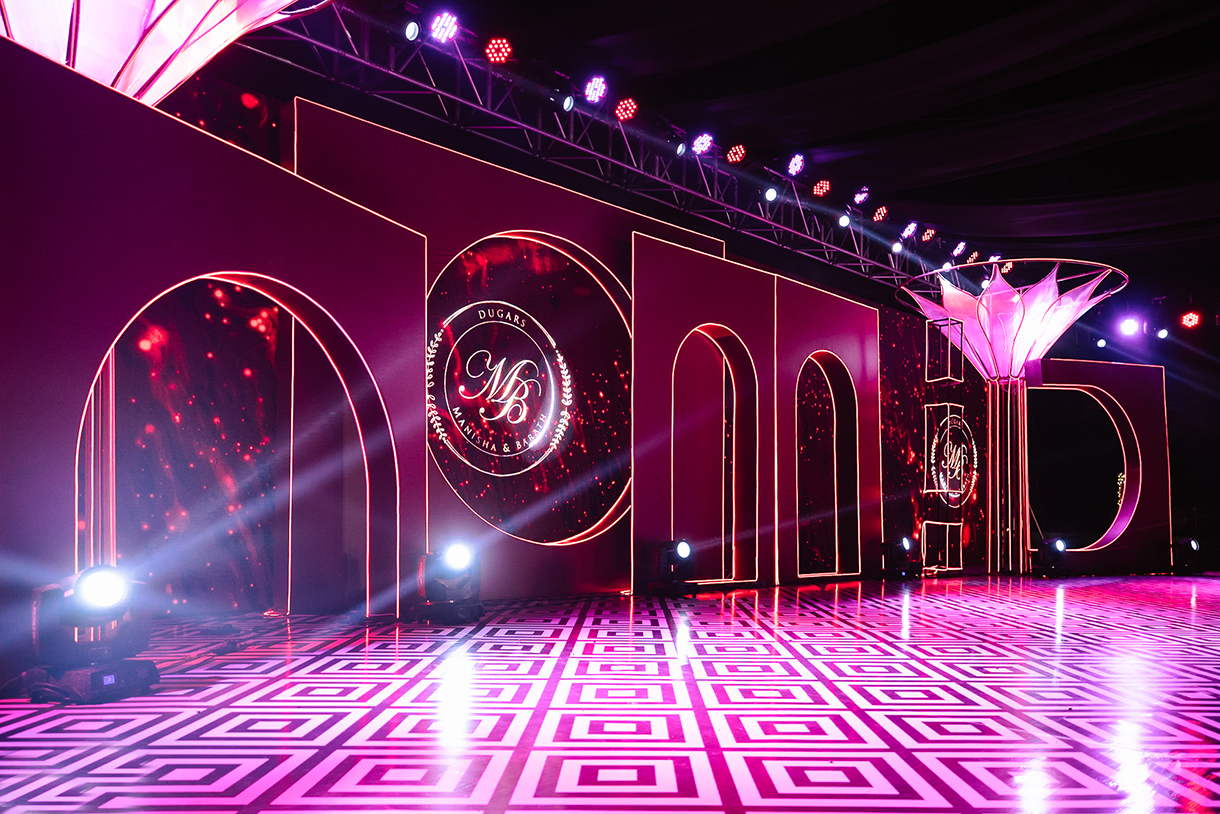 Sowmya shares, “The couple had requested an LED wall in the back as they had a lot of performances that needed different types of enhancements. We took the base idea and created asymmetric structures carrying the neon strips that gave the sangeet a whole new look! The drama of all the performances was achieved yet with a refreshing look of awe.”