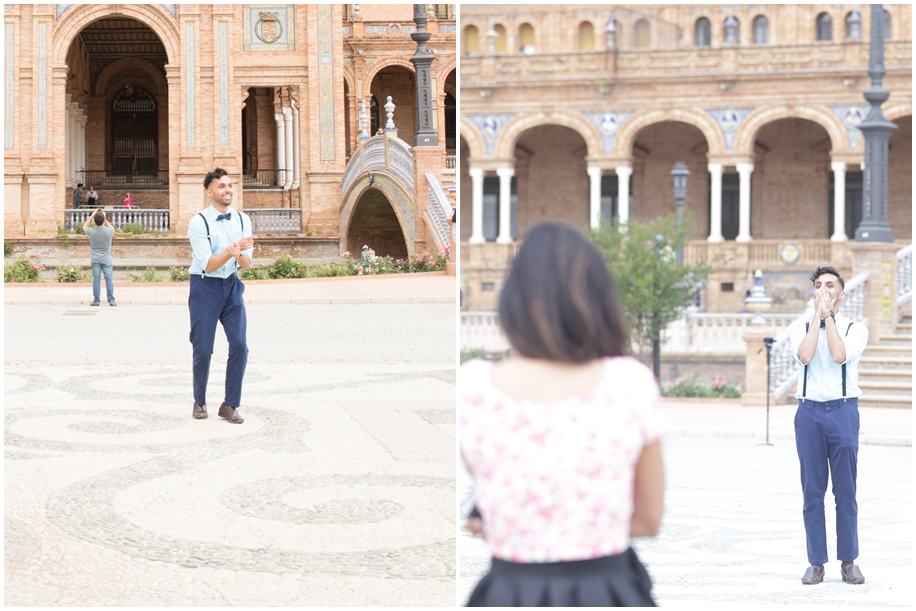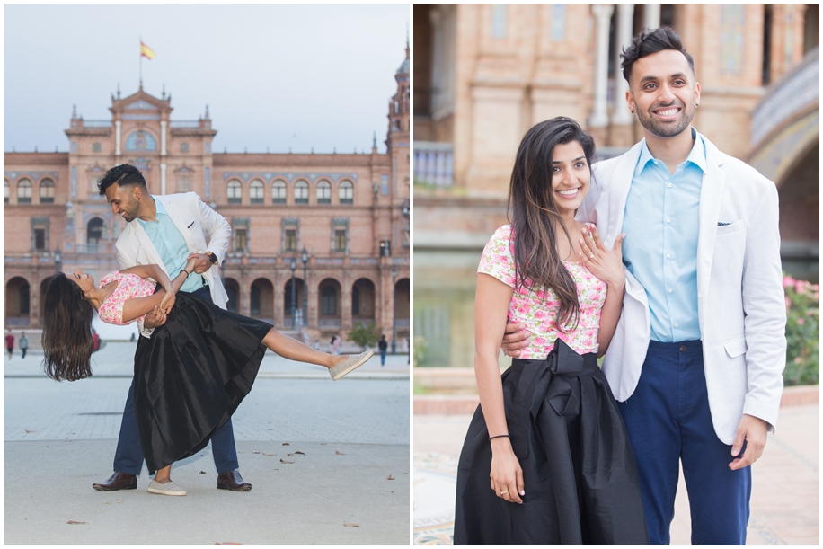 “I decided to propose to Isha when she was on a graduation trip to Spain with her best friends from dental school. I wanted the proposal to be the biggest surprise for her! I wanted it to be a moment where she would be overwhelmed with emotions and cry, while I would be the one smiling. The Spain trip provided me with the perfect opportunity to achieve this. I booked a ticket for Seville, Spain. I had discovered that it was her favorite place in the world a day before the proposal – which was another reason to love the place! On the big day, I asked her friends to bring her to Plaza de Espana which happened to be her favorite venue on that trip. As they made their way around the fountain, she heard our favorite song – ‘Ban Ja Rani’ by Guru Randhawa playing. She got excited and looked around to see where the music was coming from, and in front of her at a distance, I was dancing to it. She had absolutely no idea and couldn’t stop crying when she realized what was happening.”