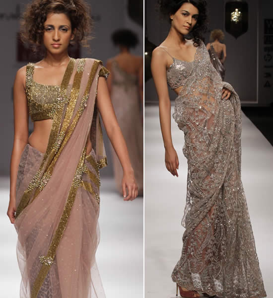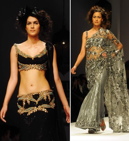At the Wills India Fashion Week last month, Rabani & Rakha presented a collection consisting of elegant saris and glamourous gowns. Net Sarees with sequined/embroidered underskirt and leopart print petticoats looked pretty. The color palette consisting of shades of salamon, teal, grey and blacks was understated yet interesting. Necklines were plunging; bejewelled blouses and cholis were tiny – yet the look was chic!