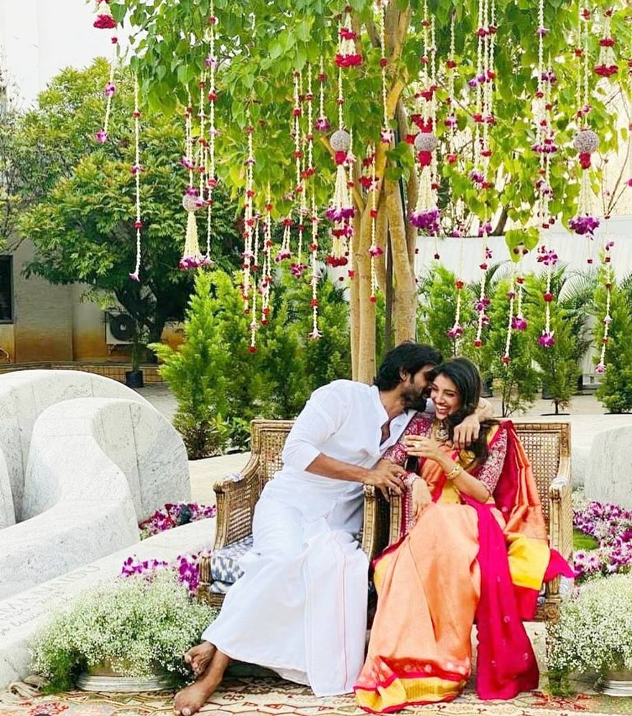 The ceremony, held at the memorial of Rana’s grandfather D Ramanaidu in Hyderabad’s Ramanaidu Studios, was understated and the couple opted for minimalist decor with local tuberoses, rudraksha and baby’s breath flowers beautifully suspended from a tree under which they laid out rustic cane furniture.