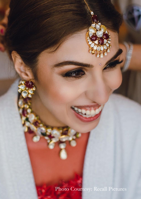 To complete her look, Sheefa chose a pair of silver kaleerein that contrasted delightfully with the ruby red hue of her lehenga. Expressing her exploratory spirit, she also went off the traditional path with her jewelry and chose statement pieces created out of cut gems and kundan work. Following a red and white color palette, her jewellery pieces included a bold maang tikka, nose piece, choker necklace, and earrings. Her makeup was simple, and included nude earthy tones, with her heavily kohled eyes being the center of focus.