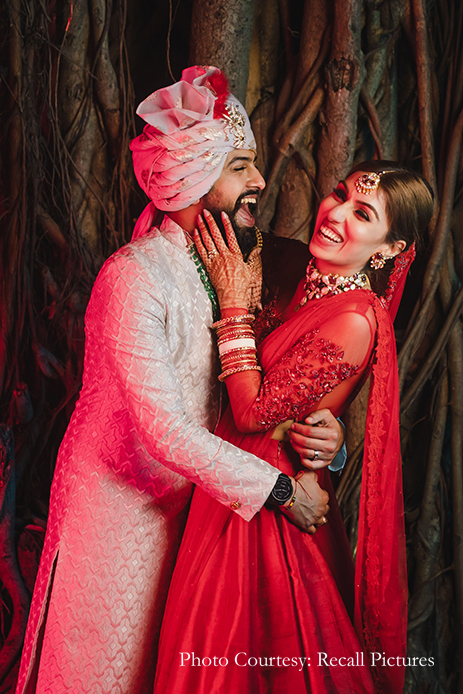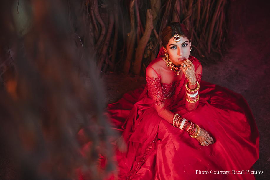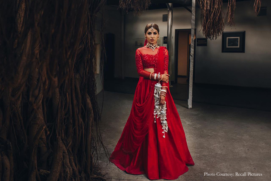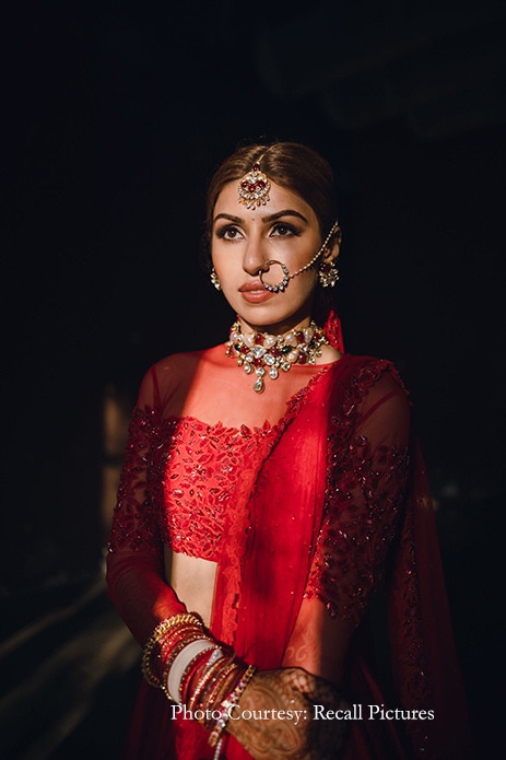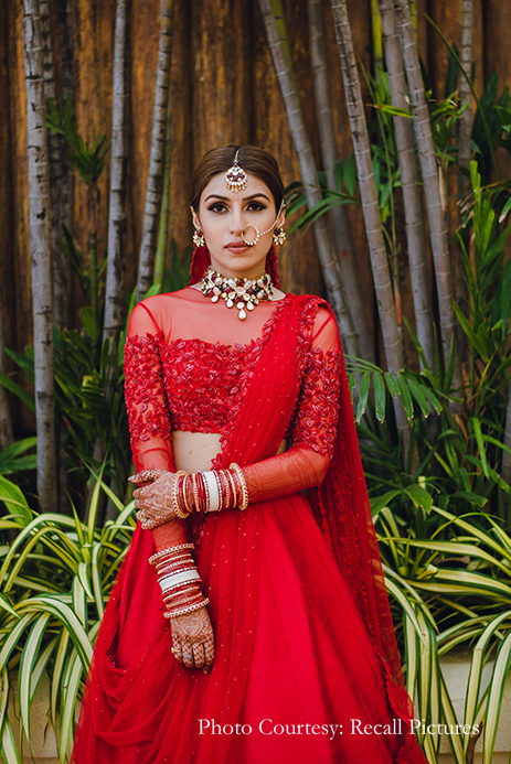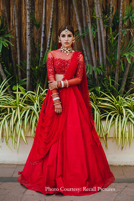 Describing the brief she received, Shloka says, “Sheefa’s brief was very straightforward. From the start itself, she had complete clarity on what she was looking for and let us know that she desired something that was understated, elegant, and versatile. Inspired by her personality, we created a lehenga that was not embellished. We also kept in mind that the ceremony was going to be an intimate one, and hence, opted to work with rich raw silk cloth in a gorgeous bright red shade with loads of cancan. Then to sign it off, we incorporated our label’s classic embellishment into a modest sheer blouse with two soft tulle dupattas. The end result was nothing short of amazing as Sheefa was the epitome of a modern-day, dreamy, unconventional bride with a hint of tradition.”