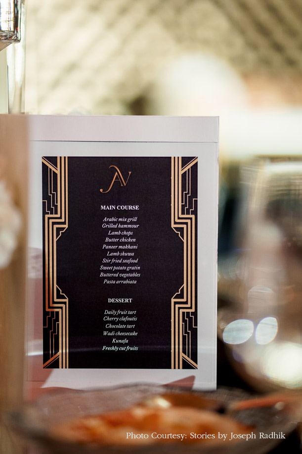 With a ‘The Great Gatsby’ theme borrowed from the bestseller book of the same name by F. Scott Fitzgerald, the reception was a glittering affair with a decor palette comprising shades of white, black and rich gold. The sophisticated facade of the Kempinski Muscat provided perfect backdrops for the event. The vast hotel ballroom where the function was hosted accommodated all the guests comfortably.