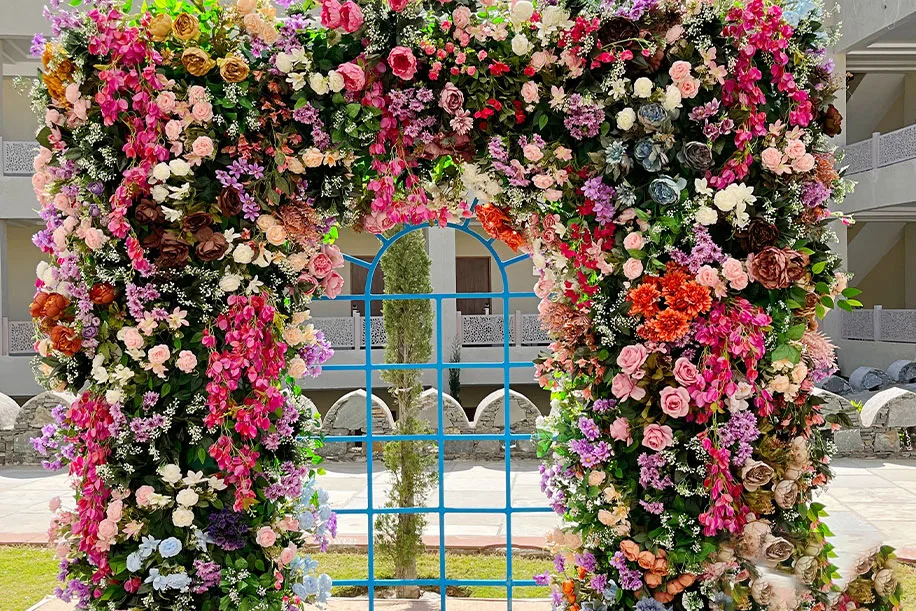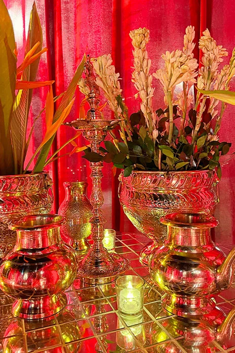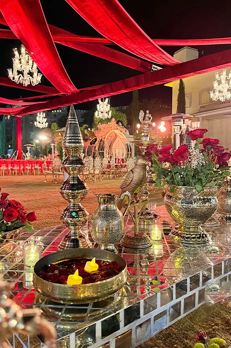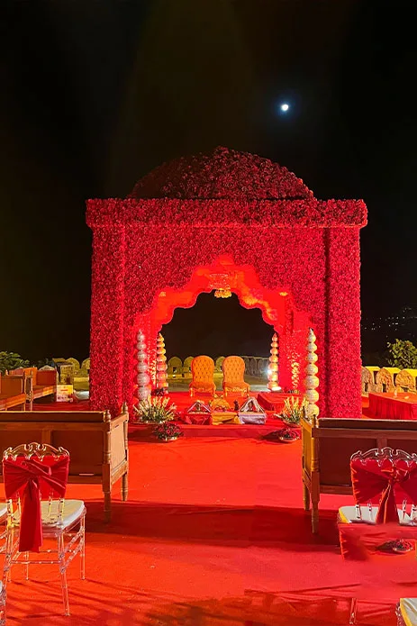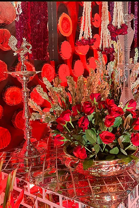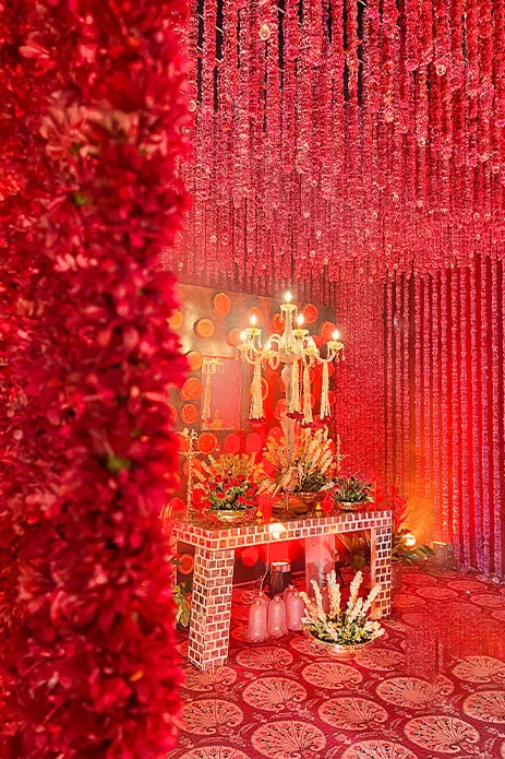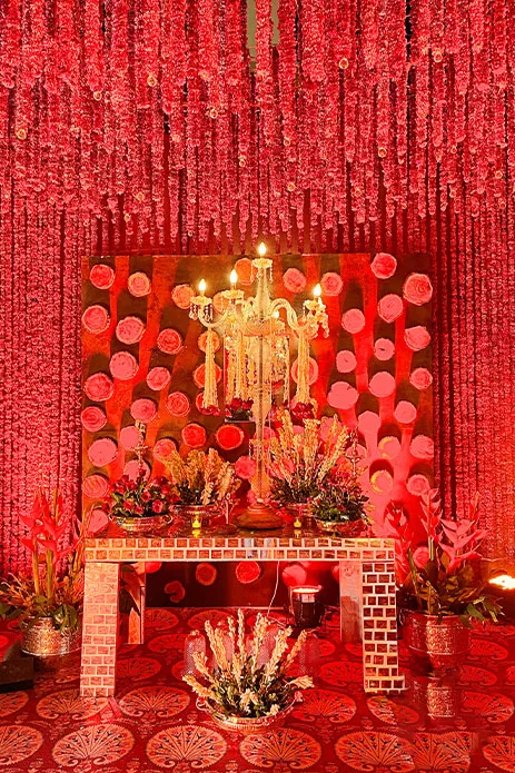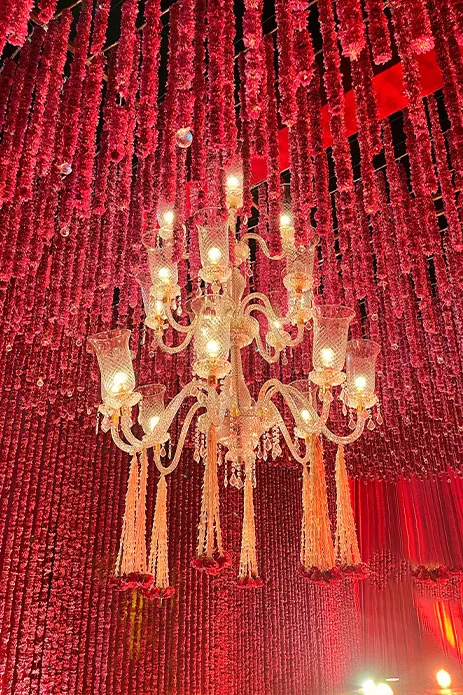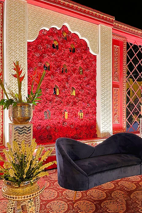 The design team saved the best for the last with a stunning wedding. Pooja shares, “The families were very sure of what they wanted. In short, they wanted to keep the wedding very traditional with copious amounts of flowers that have their origins in India. Honestly, photos don’t do justice to the red and gold wedding mandap that was created with 20,000 red roses. The was made with multiple curtains of chrysanthemums that awed guests as they walked in.”