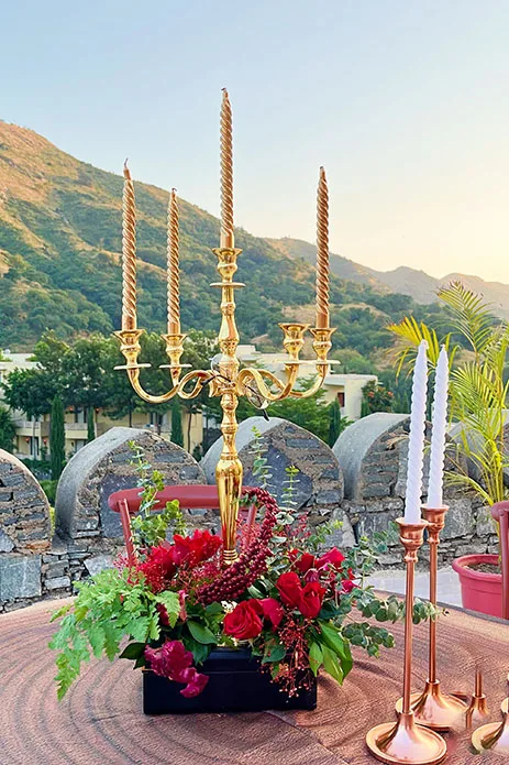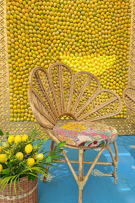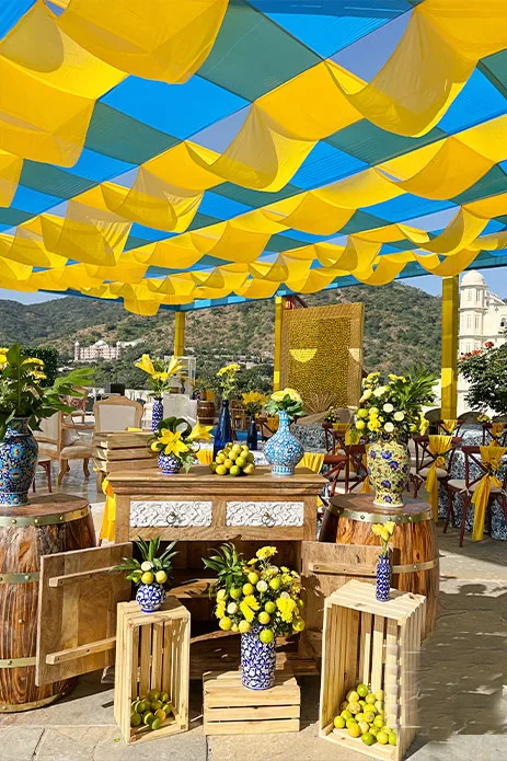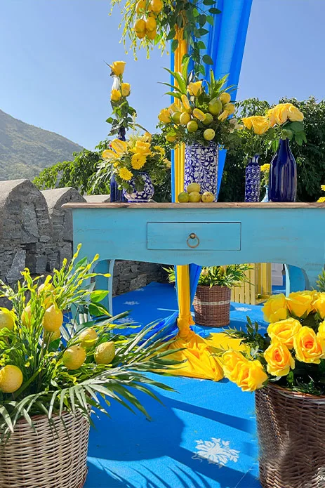Recreating the vibes of the renown Amalfi coast, Pooja and her team ensured the haldi was absolutely different than any other event. Pooja shares, “As designers we were glad that the client gave us complete freedom when it came to experimentation. Due to this we were at the liberty to let our creativity flow, which resulted in some unique decor setups. For the haldi we used over 5000 lemons to create backdrops, tablescapes, added in crates, scooters, etc. Handpainted ceramic vases in thematic hues added extra vibrancy to theme and balanced everything out.”