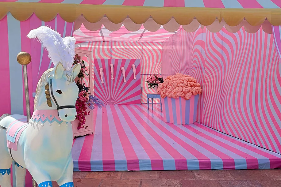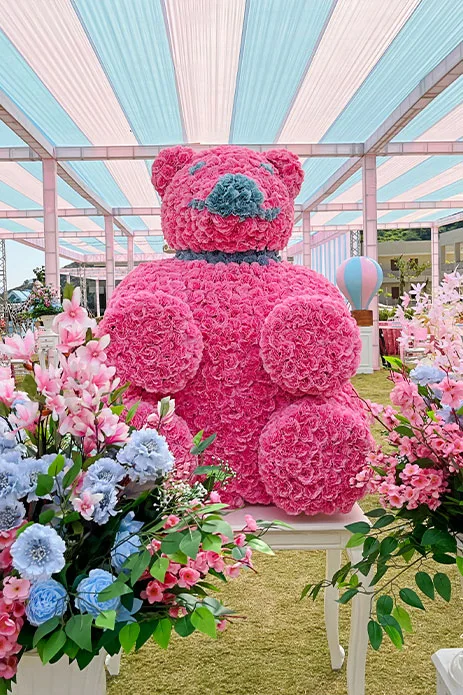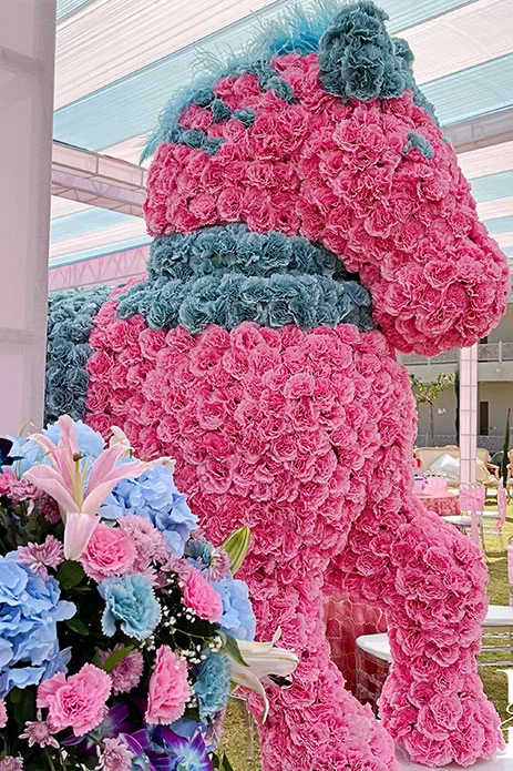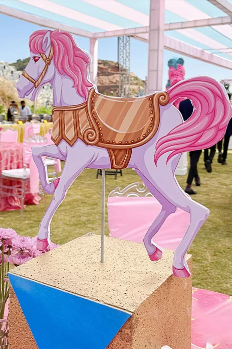 Curating concepts around the couple’s story, team Elusive Dreams by Pooja Doshi took every challenge in their stride and came up with stunning decor setups. The celebrations commenced with a Tiffany Carnival that inspired awe with its adorable decor. Pooja shares, “The Tiffany Carnival was actually a pre-wedding brunch and one of the cutest events we designed for this wedding. We made teddy bears, horses and giraffes with pink carnations. Popcorn and candy installation in tiffany blue and baby pink hues were also a part of the decor. To keep the guests entertained there were game counters, giveaway counters and multiple photo-op spots. With the mountains on one side and the lake on another, the event was a picturesque one.”