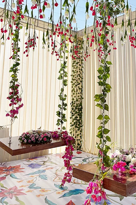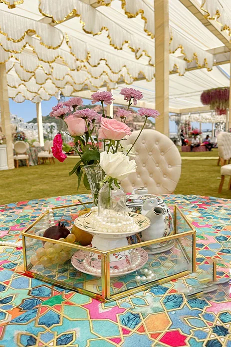 Next in line was a lush mehndi celebration hosted in a garden. Pooja shares, “The garden mehndi was rightly, an overdose of flowers! We created a three tier wisteria chandelier that gave the venue an ethereal look. In addition, we also decorated the ceiling with white scallops. And adding a dash of quirk to the proceedings were fruits, pearls, kettles and tea cups that were kept as centrepieces on the tables and consoles.”