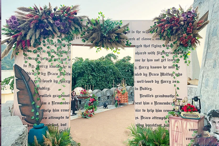Paying homage to the couple’s love for the Harry Potter series, Pooja also designed a Harry Potter-themed event that made everyone’s jaws drop. Pooja shares, “The couple is a big fan of the Harry Potter books. They bonded over the same when they first met, so it was very close to their hearts. Inspired by this, we dedicated an entire event to this theme. Smallest of details from the books, like, imitation messenger owls, quills with ink pots, old-school typewriters, magic brooms, house-based capes, round eyeglasses etc. were included in the decor. “
