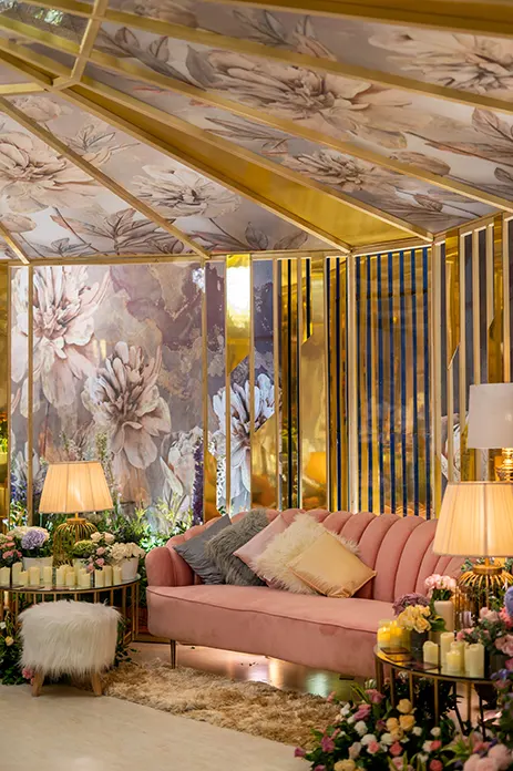 Conceptualized with the theme of ‘garden of geometry’, the décor played with structural shapes and clean lines, juxtaposed with the softness and feminine allure of floral installations. A lush green entryway led to the enchanting hexagonal foyer, along with a floral print ceiling hung with a crystal chandelier. Lavender hues of the walls were offset by the gleam of golden metal furniture and props, as well as columns and pillars. Blooms in gorgeous spring hues of pink, purple and white, decked every surface in myriad arrangements, with pops of blue for a fun surprise. Formal chairs were swapped out for lush velvet sofas in blush and grey for a cosy feel, accessorized with fuzzy pillows which lent a luxurious, Parisian vibe to the evening. Candles abundantly cast their warm glow on the festivities, exuding an air of romance.
