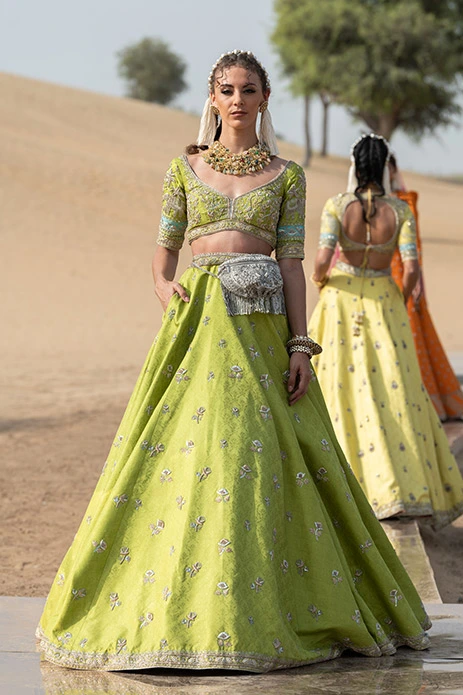 For the new-age bride who doesn’t shy away from a punchy hue, this light green lehenga with its delicate floral motifs and silver belted bag is a clear winner.