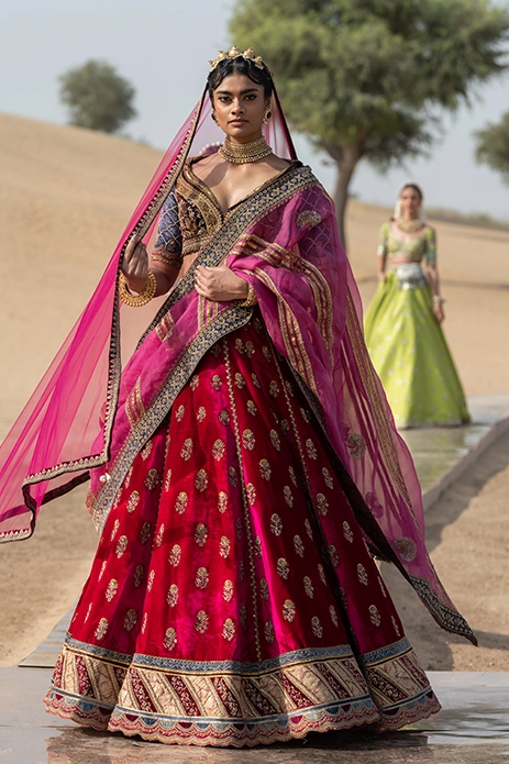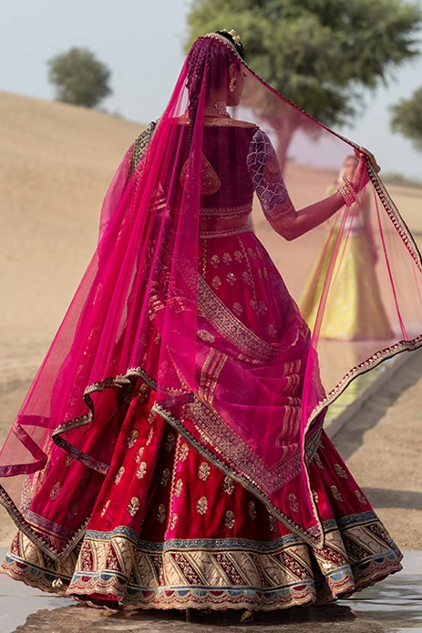 Crafted out of plush velvet and paired with a plunging choli, these deep red outfits give tradition a colorful twist with its pops of teal and a scalloped hem.
