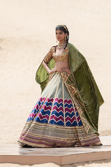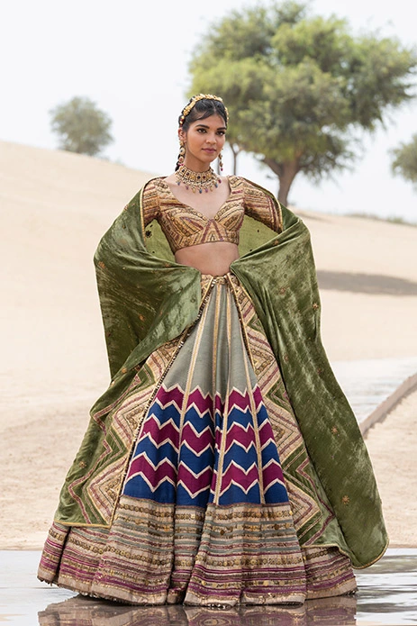 Minimalistic yet vivid this lightweight lehenga gives you the best of both worlds with its modern chevron pattern and heritage zari work.