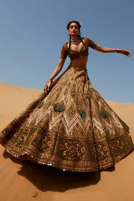 Inspired by the architectural wonders of the majestic Jodhpur city in Rajasthan, Marwar Couture fuses high-quality craftsmanship and tradition together to create lehengas that are bound to make a statement. Generously using fine thread work to depict heritage motifs, their outfits ensure you stand out of the crowd effortlessly.