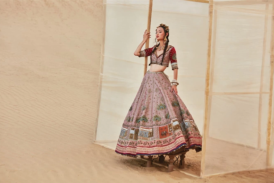 Quirky and quintessentially desi, this dusty rose lehenga is nothing less than a work of art with its graceful depictions of royal life circling the skirt.