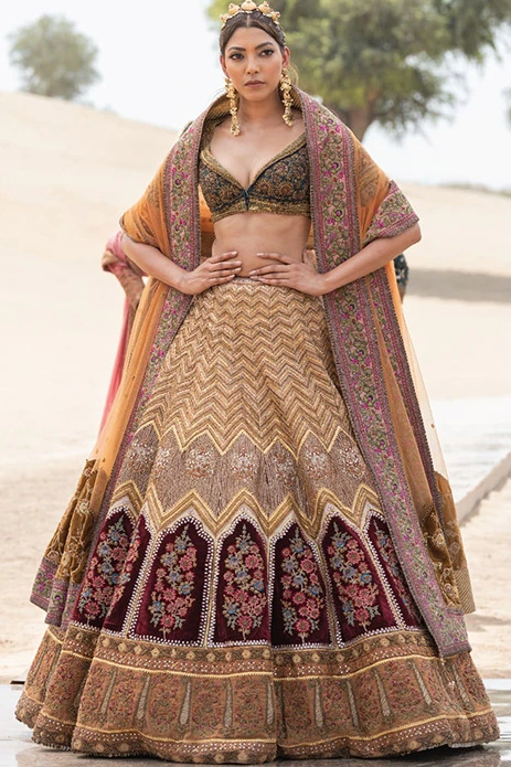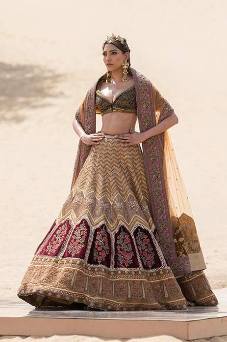 One can never go wrong with gold! Flaunting a chevron pattern that is accentuated by pops of merlot, this lehenga scores high on glitz and elegance.