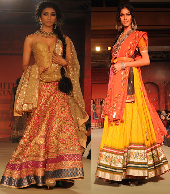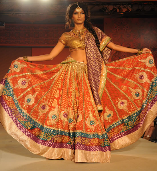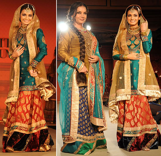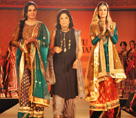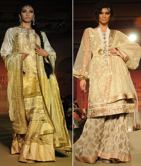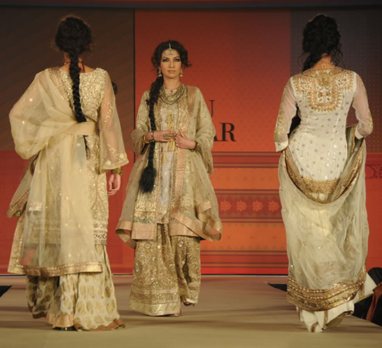 Ritu Kumar in association with Taj Group of Hotels Resorts and Palaces and American Express presented “The Falaknuma Collection” inspired by the interiors of the famed palace of Hyderabad. Highlighting the heritage of craftsmanship that the city of royal Hyderabad is renowned for, the collection consisted of exquisitely embroidered lehengas, saris, coats, kurtas, shararas and skirts. The venue– Taj Lands End added to the charm of the collection- the backdrop of the Jharokas against the catwalk and candle votives giving it a surreal aura.