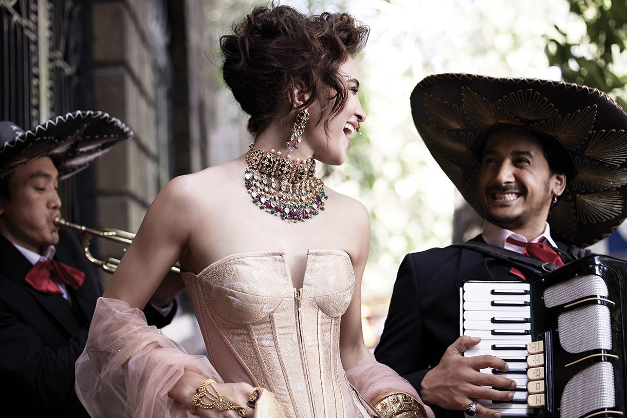 For the modern Indian bride, the fun is in fusion! To jazz up the night of music and cocktails under the bright stars, she adorns an opulent layered necklace studded with pink and red rubies, inspired by the grandeur of Mughal Heritage. The necklace beautifully contrasts Tarun Tahiliani’s sequined cape and off-shoulder lehenga choli with encrusted stones, with the gold seamlessly complementing the silver-night event. A matching gold and ruby hathphool, kadas, floral ear studs, and a maang tikka from Rivaah by Tanishq complete the look.