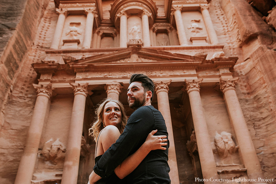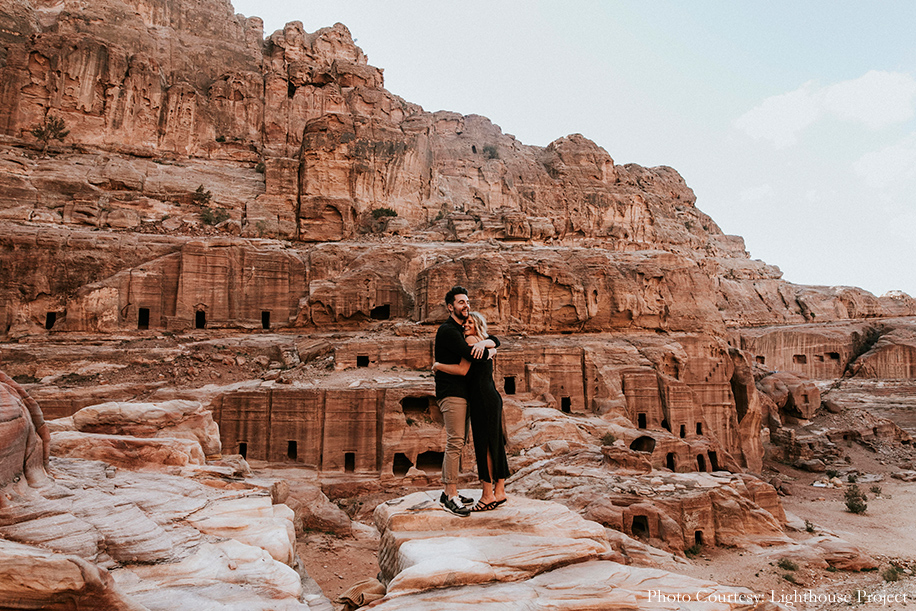 The couple met with their photographer from The Lighthouse Project a day prior to the vow renewal ceremony in the ancient city of Petra for a photo-shoot. “Petra was definitely the best location for what we had in mind for our Photoshoot. We enjoyed every minute of the planning and after a good search, we decided to go ahead with Teo and Anna from Lighthouse Photography. We immediately fell in love with their style and mood in their photos. We trusted them from the very first moment and discussed our vision and the locations that we had in mind via Skype” shares Charlotte. She goes on to elucidate on the concept and mood of their pictures and talks about her favorite photograph. “What we wanted for our pictures was a free-spirited, adventurous and non-posing style. The shoot was so easy going and we really enjoyed it. When we received our gallery we loved every picture in it but there is one that is our absolute favorite. It’s that where we are walking hand by hand in front of The Treasury or Al Khazneh. Stunning!” she says.