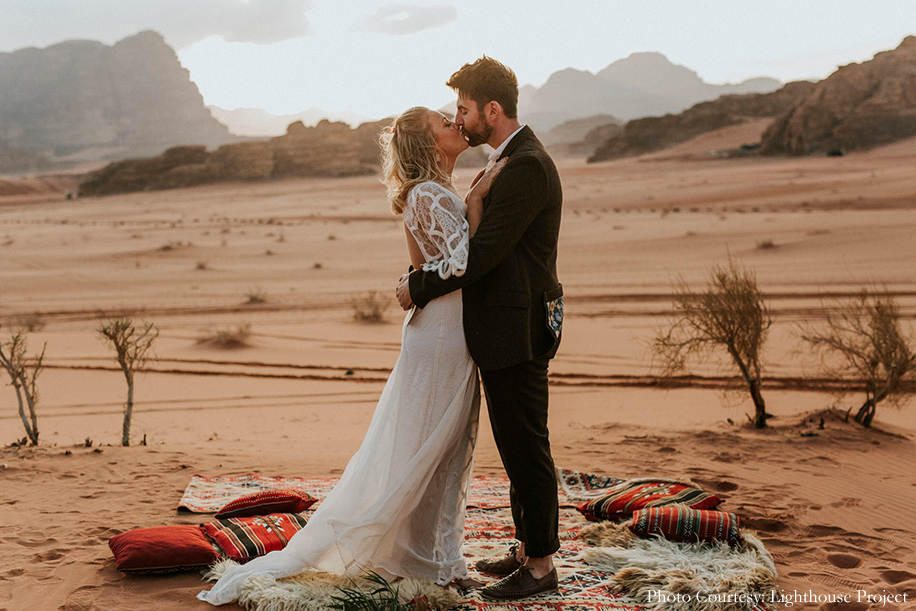 Charlotte and James from South England had already had a legal wedding but something was still missing. So one day, they packed their bags and ‘ran away’ to exotic Jordan’s otherworldly desert of Wadi Rum for a symbolic ceremony. “Jordan is an amazingly beautiful country with epic locations and breathtaking beauty. The country has always been on the top of our bucket list and we’ve always dreamt of ourselves in the desert,” says James.
