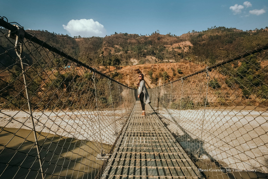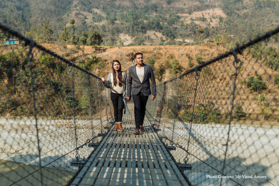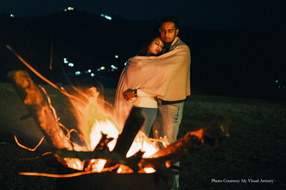 From rope bridges to rustic hamlets, colorful temples to a serene lake, every shot captures the magical aura of Nepal as well as the natural chemistry between the couple. From freewheeling poses in glamorous ensembles to a glowing bonfire with the couple wrapped in a blanket – each concept and angle worked beautifully in this pre-wedding photo shoot.