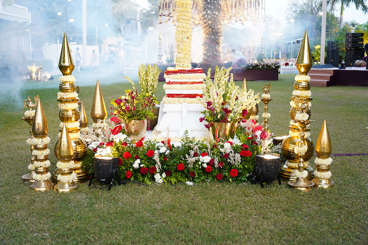 The wedding unfolded in a poetic symphony of red and ivory, reminiscent of royal soirees. The varmala stage was an opulent floral marvel, adorned with a profusion of red Roses and white Chrysanthemum blooms, while naturally grown maroon Chrysanthemum flowers added an earthy richness.