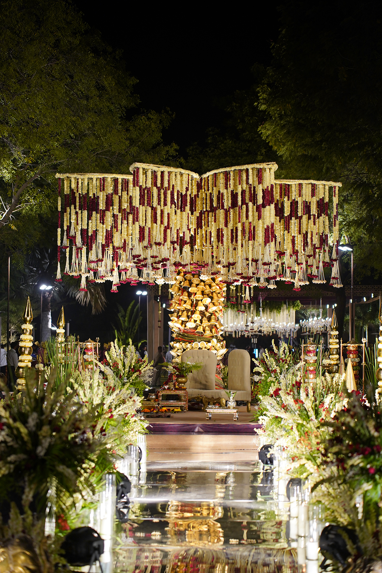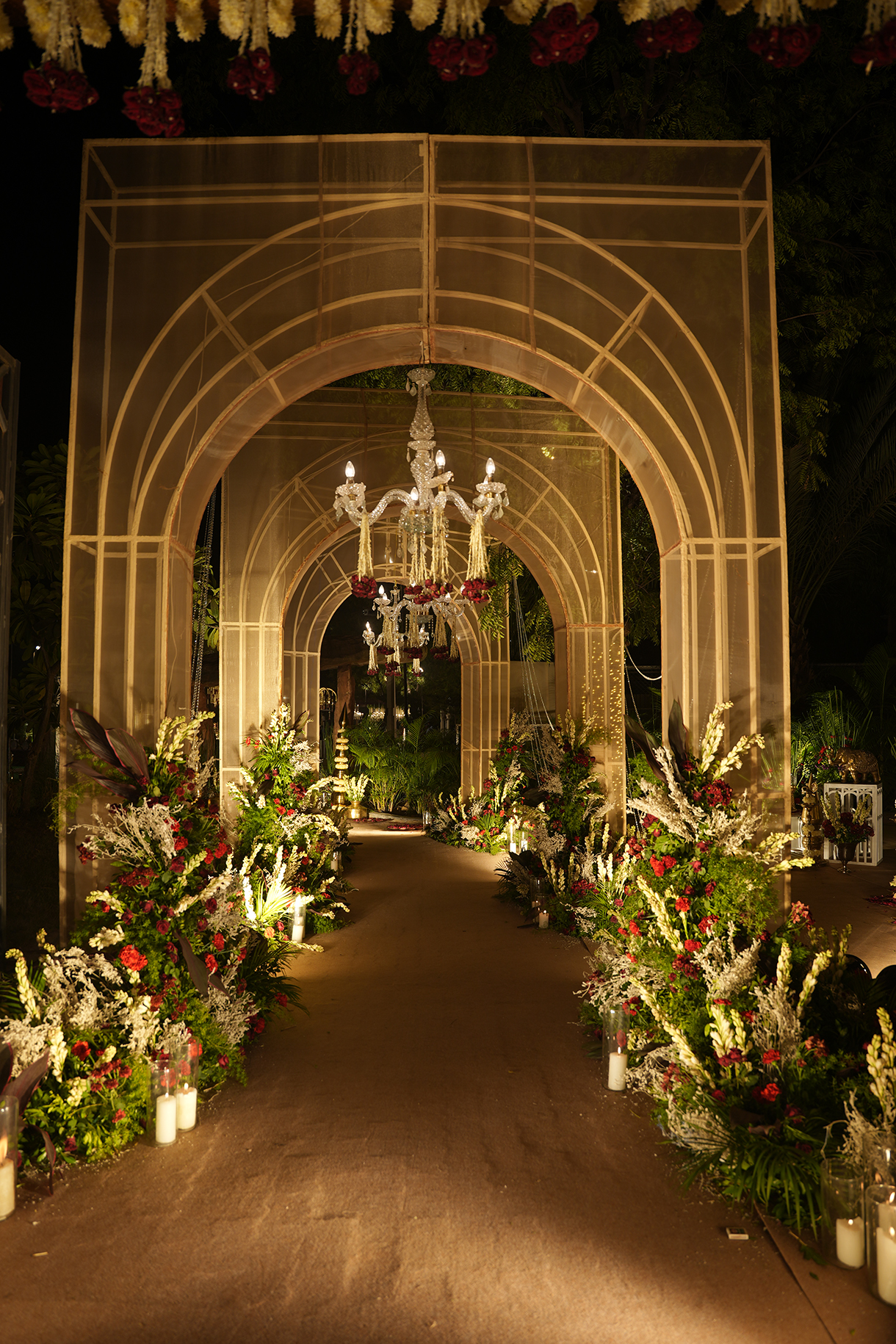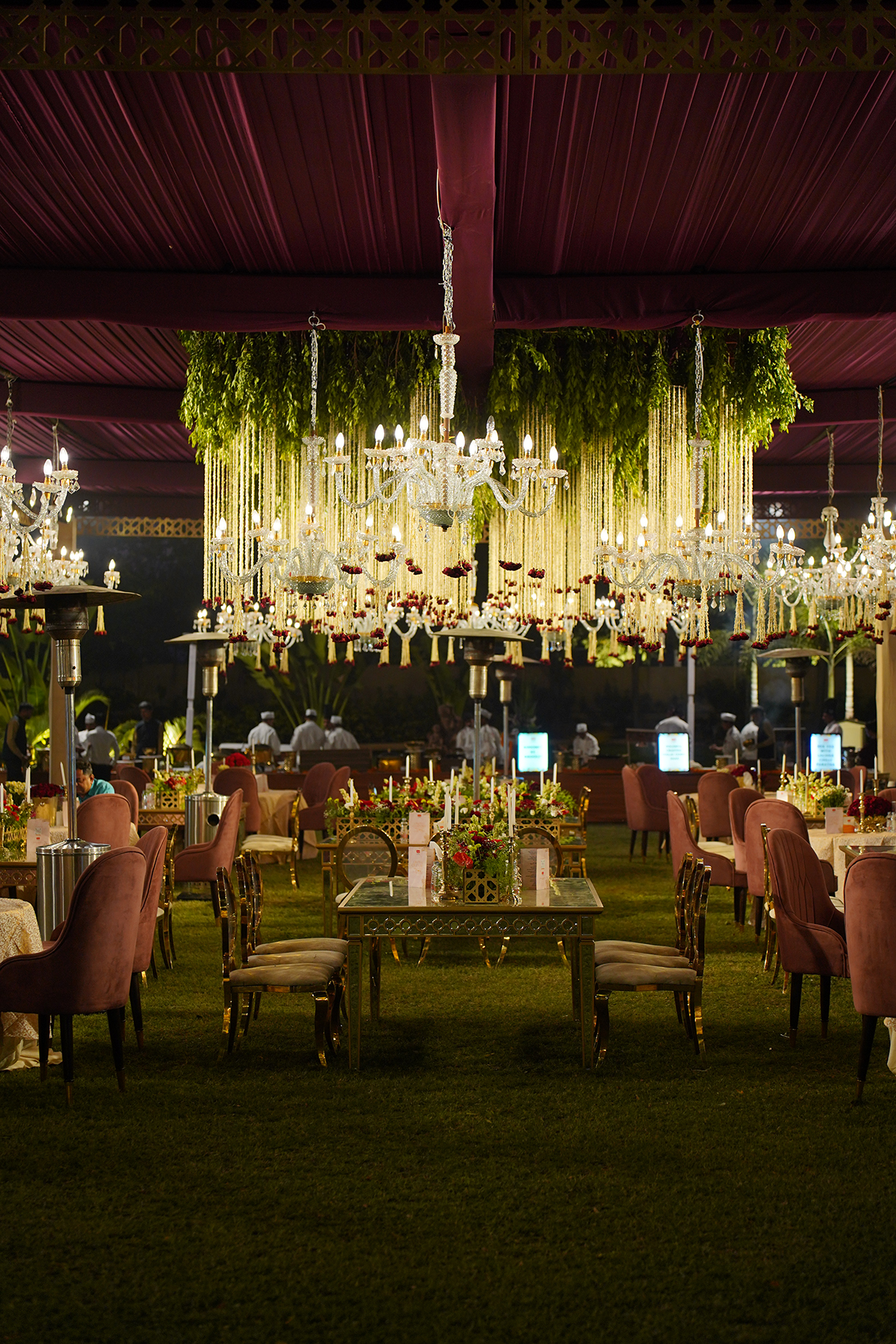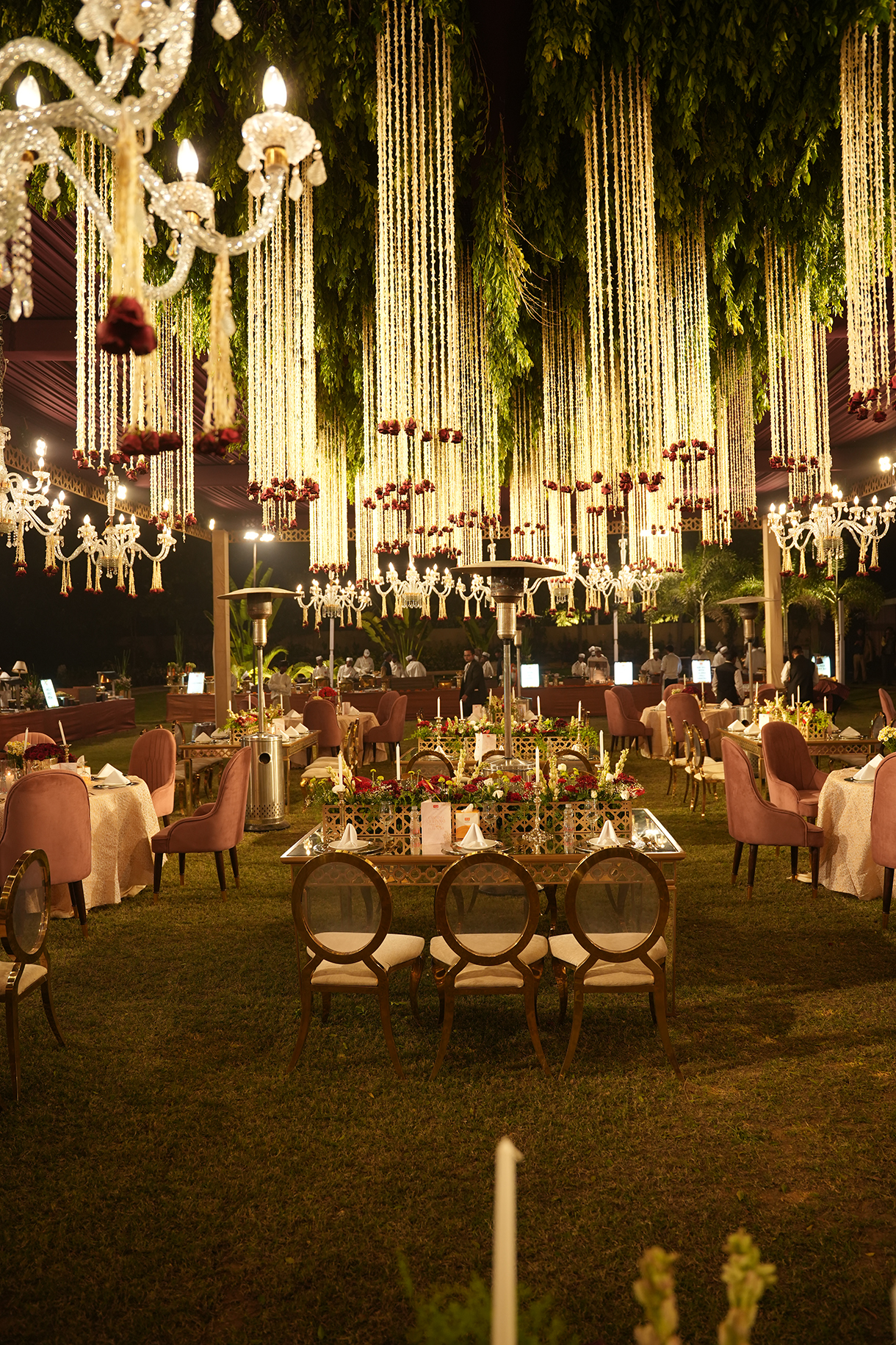 A mirror aisle created a surreal bridal entry, reflecting every emotion, every moment, in a breathtaking vision of love. Overhead, a Rajnigandha chandelier adorned the dining area ceiling, casting a delicate glow that mirrored the intimate charm of the night. As the couple exchanged garlands beneath the open sky, fireworks illuminated the night, marking a celestial and grand moment.