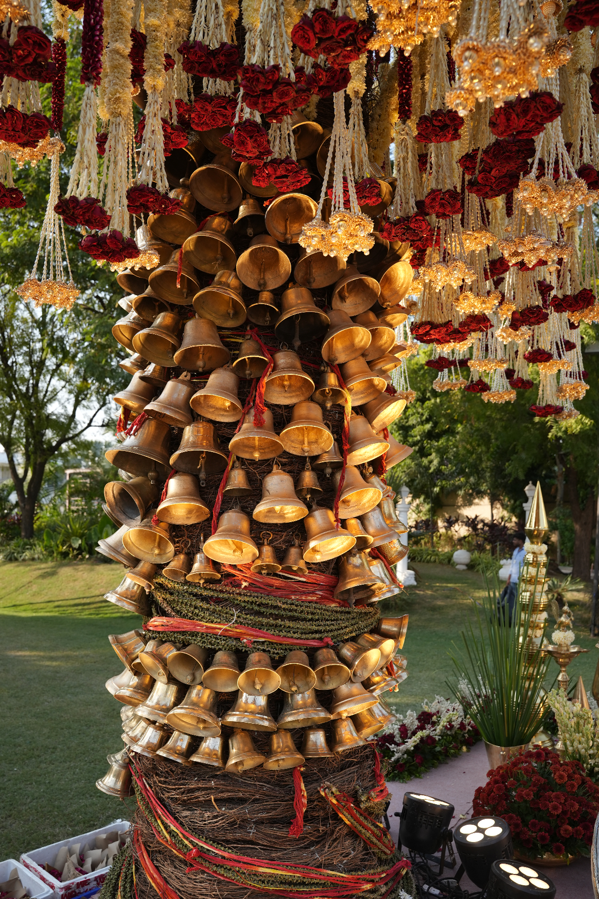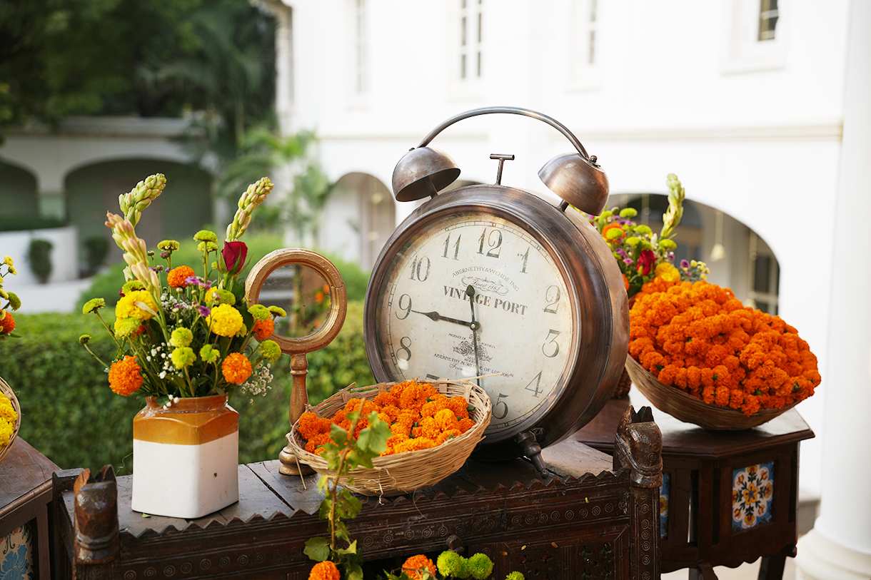 The prelude to the grand celebrations unfolded at Himalaya Mansion, where an ethereal Mandap Muhurat ceremony set the tone. Guests were welcomed into a space that exuded elegance, with a wooden console table adorned with vintage floral elements as the perfect photo-op.