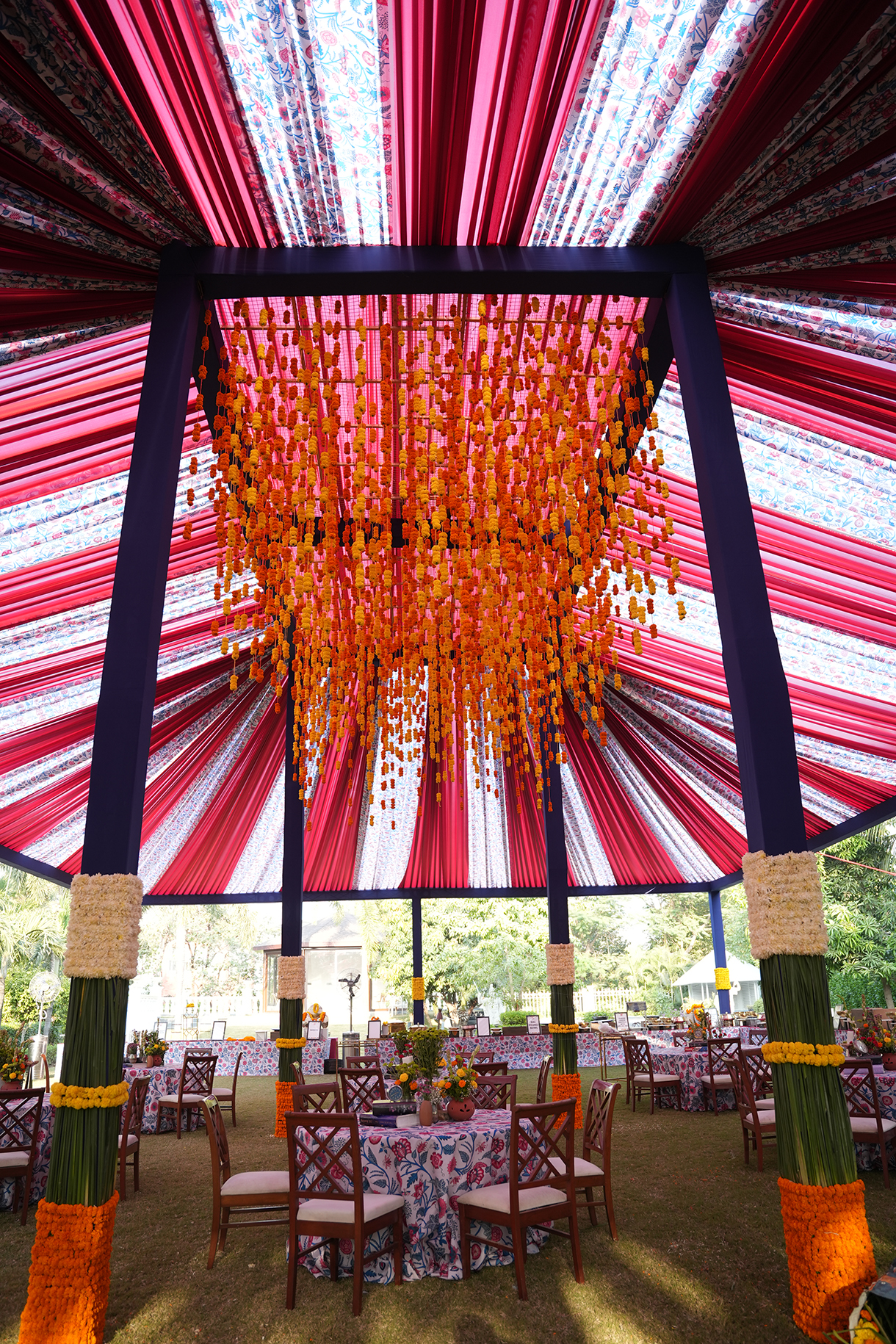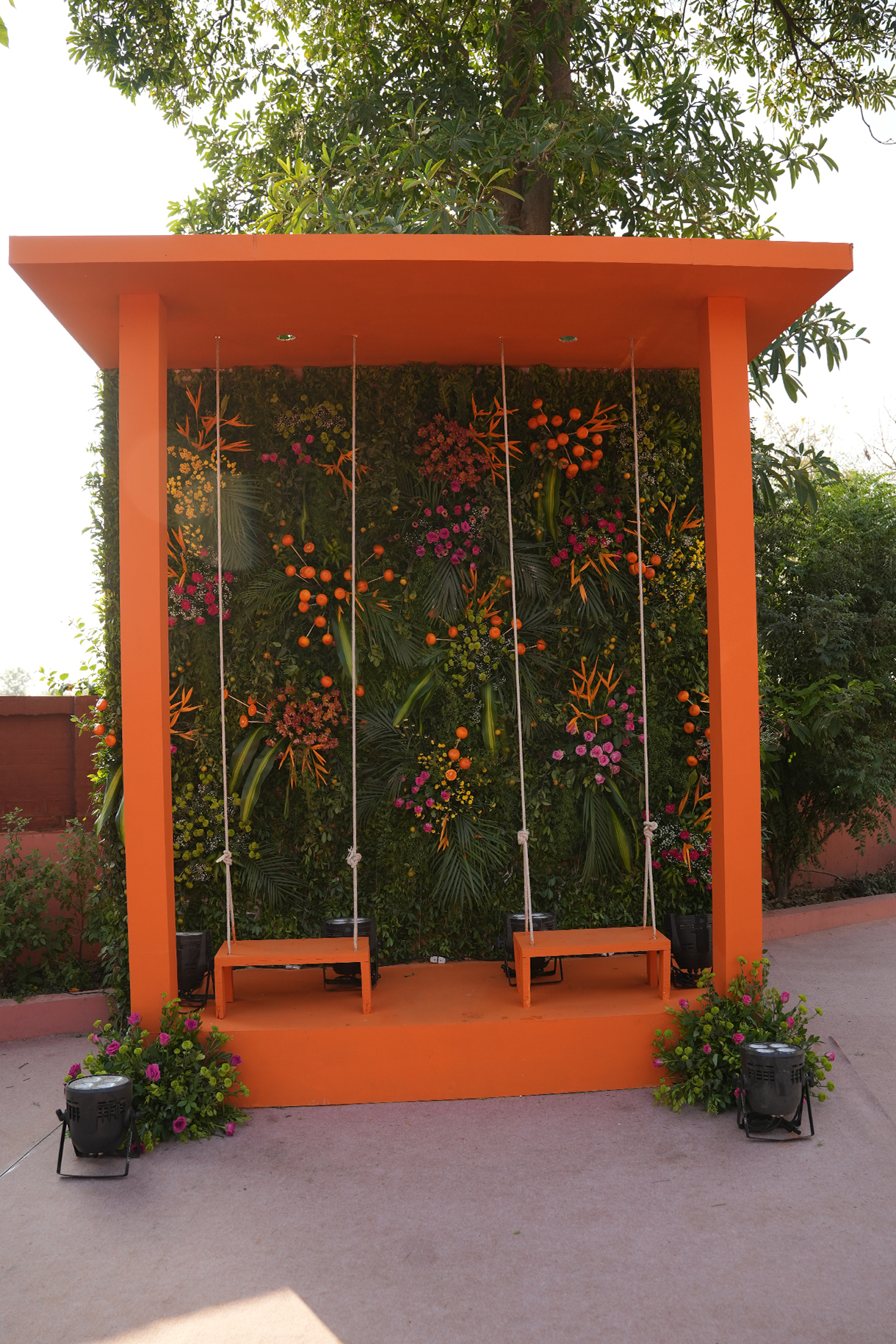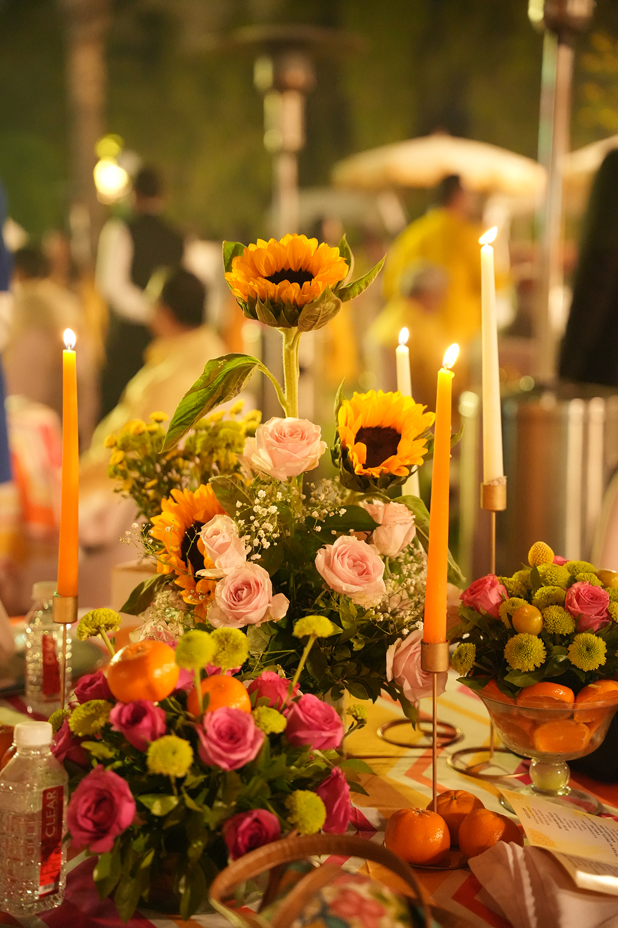 The Haldi ceremony was a burst of sunshine wrapped in a vibrant mandarin-themed palette. The venue was a poetic play of oranges, yellows, and pinks, with canopies of umbrellas, vibrant floral accents, and delicate details that echoed the exuberance of the moment. The couple’s dance floor backdrop was a vision – an artful blend of colors and cultural symbolism.