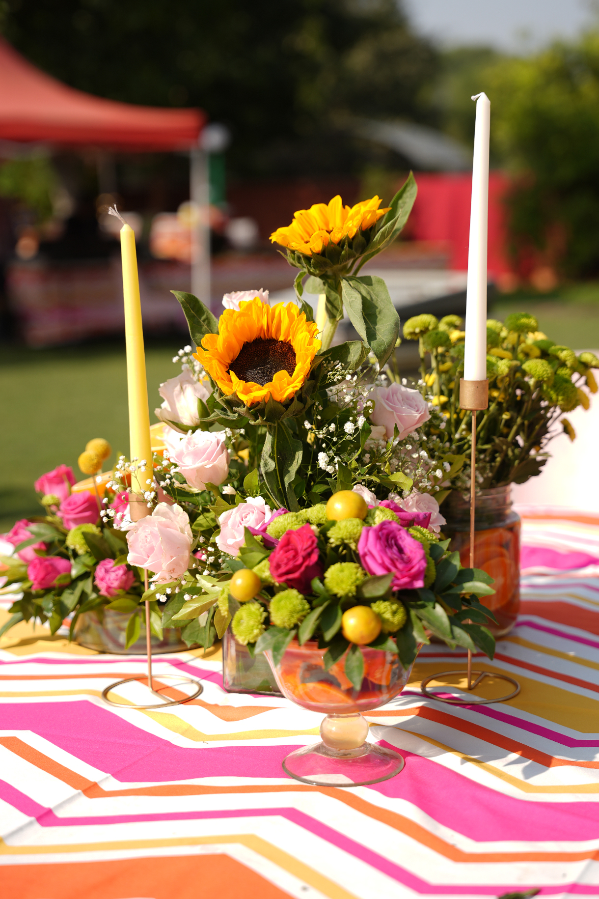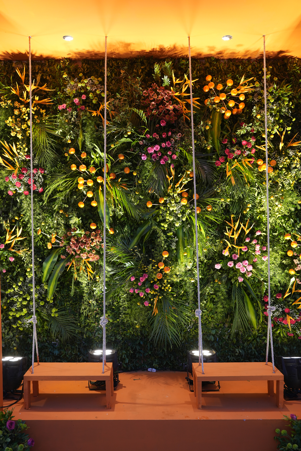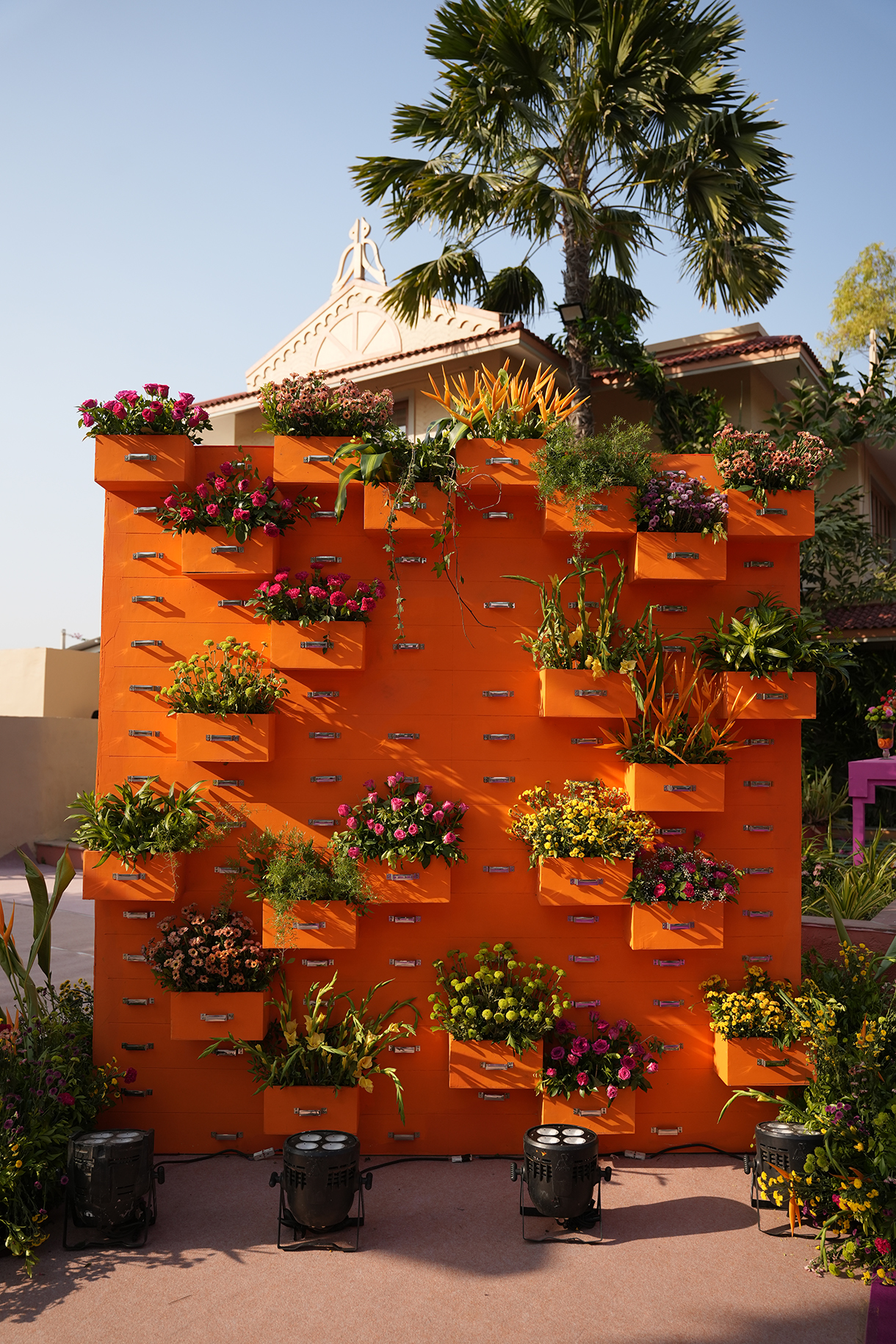 The Haldi ceremony was a burst of sunshine wrapped in a vibrant mandarin-themed palette. The venue was a poetic play of oranges, yellows, and pinks, with canopies of umbrellas, vibrant floral accents, and delicate details that echoed the exuberance of the moment. The couple’s dance floor backdrop was a vision – an artful blend of colors and cultural symbolism.