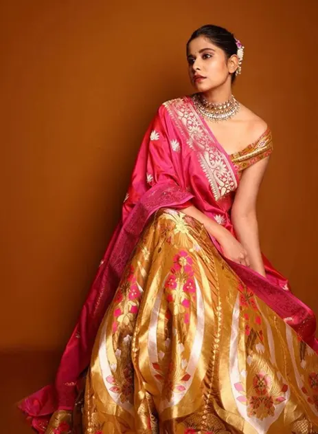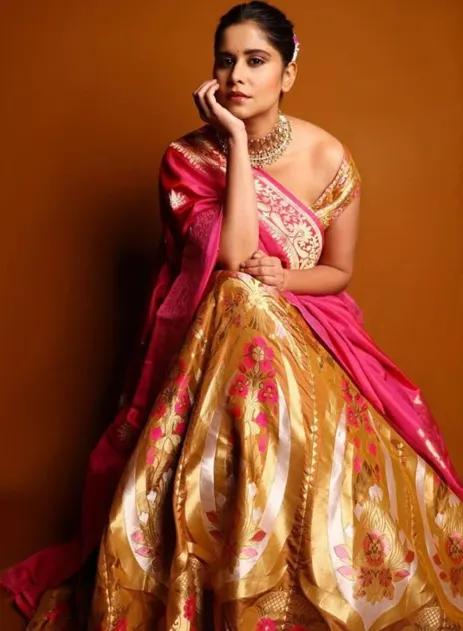 If you think Banarasi sarees and lehengas are meant for brides, we’ve got something to share! Check out how Marathi Actress Sai Tamhankar slayed her festive look in a mustard-hued Banarasi lehenga paired with an off-shoulder brocade blouse and organza dupatta. The rich weave not only adds a touch of elegance to your look but is also a handloom that’s here to stay forever in trend. Bridesmaids can pair up their banarasi lehenga with a low bun look and a statement choker this wedding season.