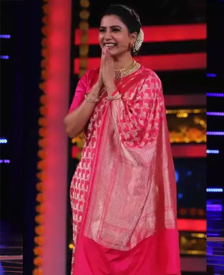 Telugu star Samantha Akkineni was seen hosting Bigg Boss Telugu Season 4’s Dussehra special episode in a traditional six-yard drape and we love the wedding-ready look! Donning a woven fuchsia silk saree from Kshitij Jalori, illustrated with floral motifs woven with pure zari, Samantha looked effortlessly festive. She accessories her look with a heavy gold necklace, matching earrings and gold bangles from Krsala Jewellery.