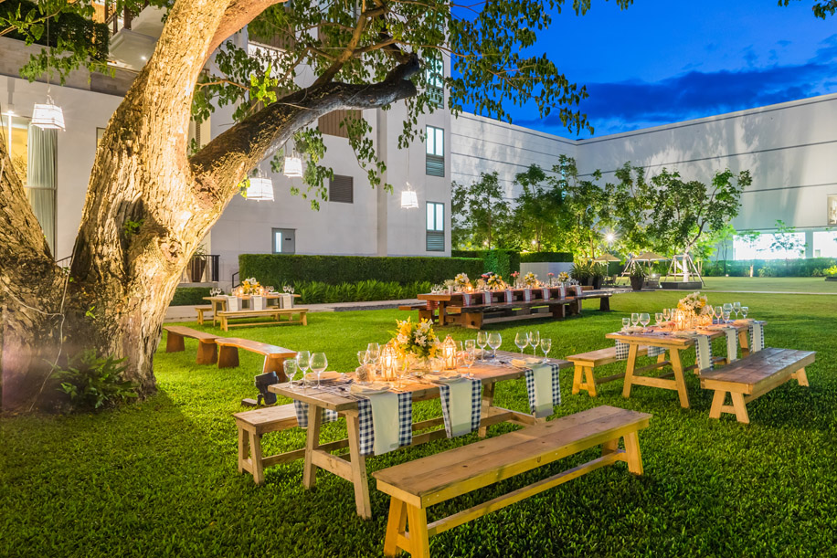 Set against the backdrop of the high-style royal heritage era of the 1920s the resort has no dearth of captivating venues for your ceremony. From its spectacular beachfront, expansive manicured lawns or the well-planned indoor spaces, the options are endless. The Tamarind Ballroom is full of natural light and can seat up to 200 people. The hotel’s 3,200 square meters Larn-Com Courtyard is perfect for couples who want to take advantage of the two tamarind trees there under which they can host certain ceremonies. The traditional Thai Sala and Koi Garden are also charming spots, and collectively, they make for an ideal and spacious venue for a large-scale wedding.