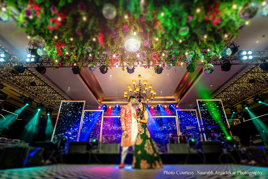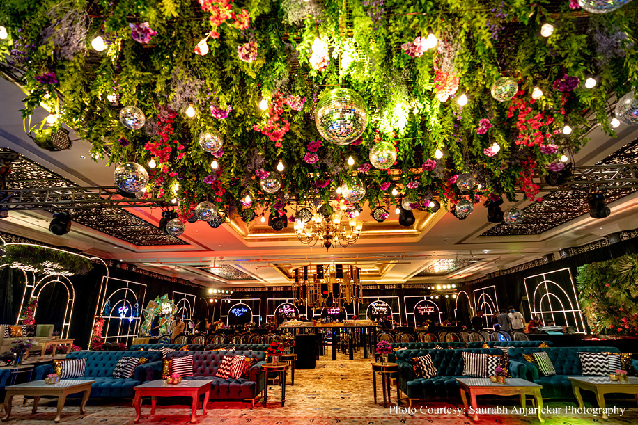 Kicking off the celebrations was a mehndi celebration that also doubled up as a cocktail party. Here the glamour bar was high as it followed a tropical theme with burgundy florals and a mesmerizing play of lights. With a monochrome dancefloor, exotic dancers, LED Lights and an array of interesting cocktails – this event had everyone shaking a leg!