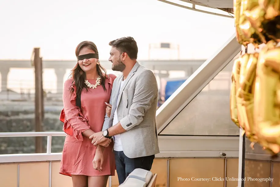 On the day of the proposal, Khanjan instructed me to get ready by 4 PM and informed me that he’ll be picking me up. The moment I heard this, I knew that he had something special on the cards for me! I got ready, and joined him in the car, just then I was blindfolded! Soon we reached our destination and Khanjan led me, still blindfolded, up the stairs of the yacht. He finally untied my blindfold and I realized that he had booked an entire VIP deck of the yacht and had decorated it with flowers. On the glass wall, golden balloons spelt out ‘Will you marry me?’ Throughout our courtship, both of us would constantly exchange songs with each other and on the deck, he played a romantic song that he’d never shared with me before! Soon enough, he was on one knee, with a ring in his hand and I couldn’t help but utter an excited ‘yes!’ It was one of the most memorable moments of my life and we had such fun on the deck as we celebrated, watched the waves crash and witnessed the dramatic sunset.”