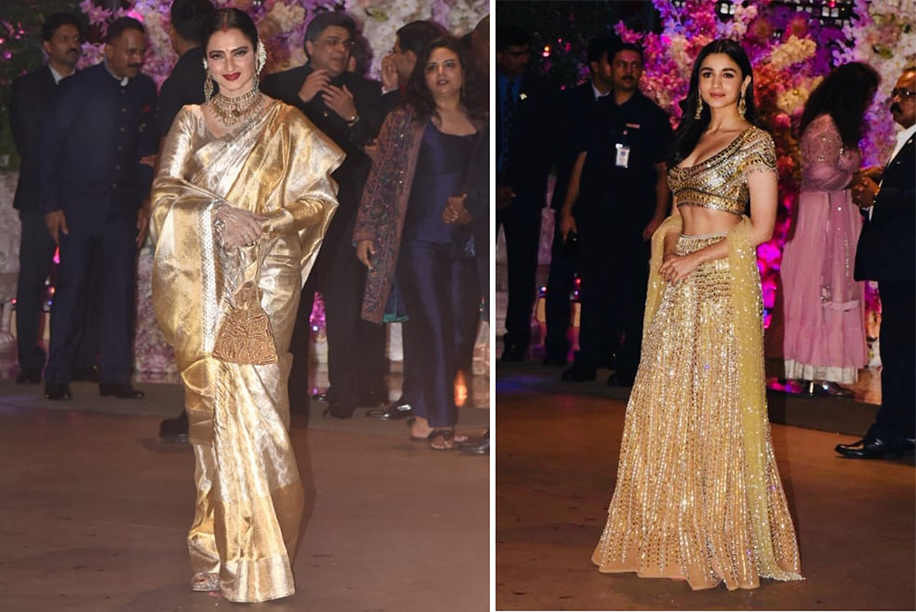 4. Rekha looked as gorgeous as ever in her signature golden kanjevaram saree. Alia Bhatt too sported the same hue with a more contemporary approach by opting for a lehenga by designer duo Abu Jani Sandeep Khosla.