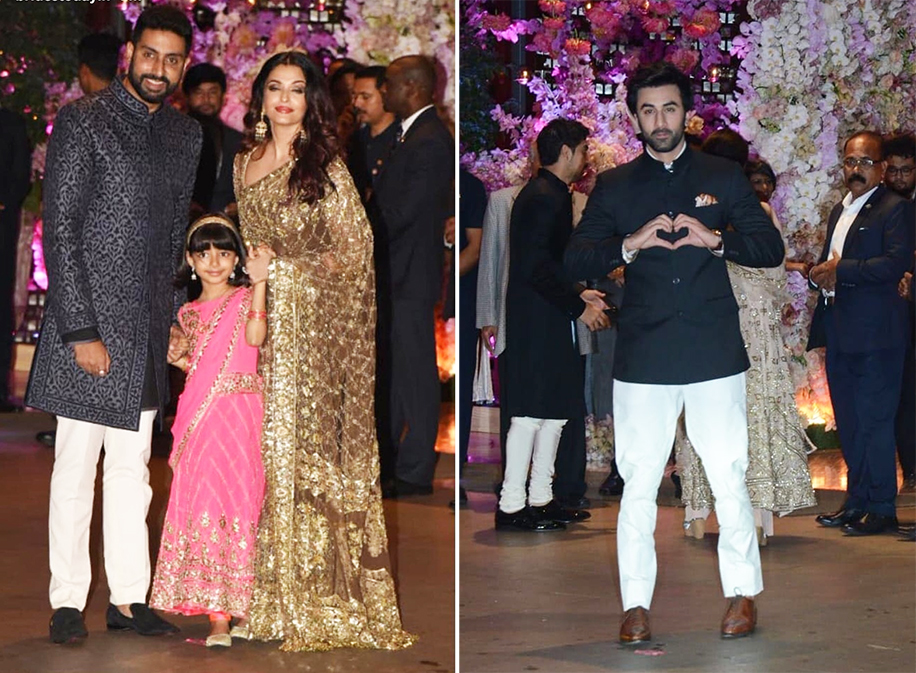 7. Isha and Nita Ambani weren’t the only mother-daughter duo who appeared in finery created by the same designer. Aishwarya Rai Bachchan and Aradhya Bachchan too opted ensembles from the same couturier. While the former miss world Miss world chose a golden and black saree by Manish Malhotra, daughter dearest looked lovely in a pink lehenga. Ranbir Kapoor was seen striking a pose in a black bandhgala jacket and white pants by Raghavendra Rathore.