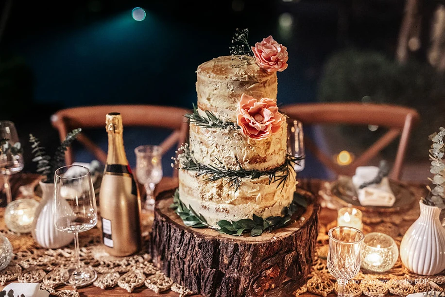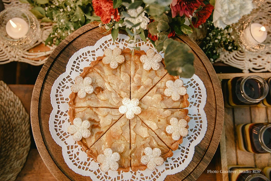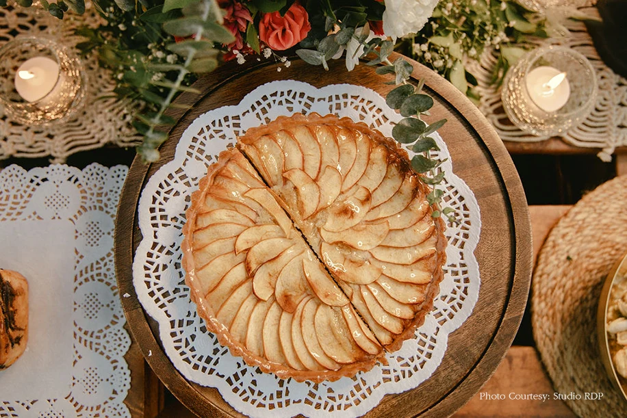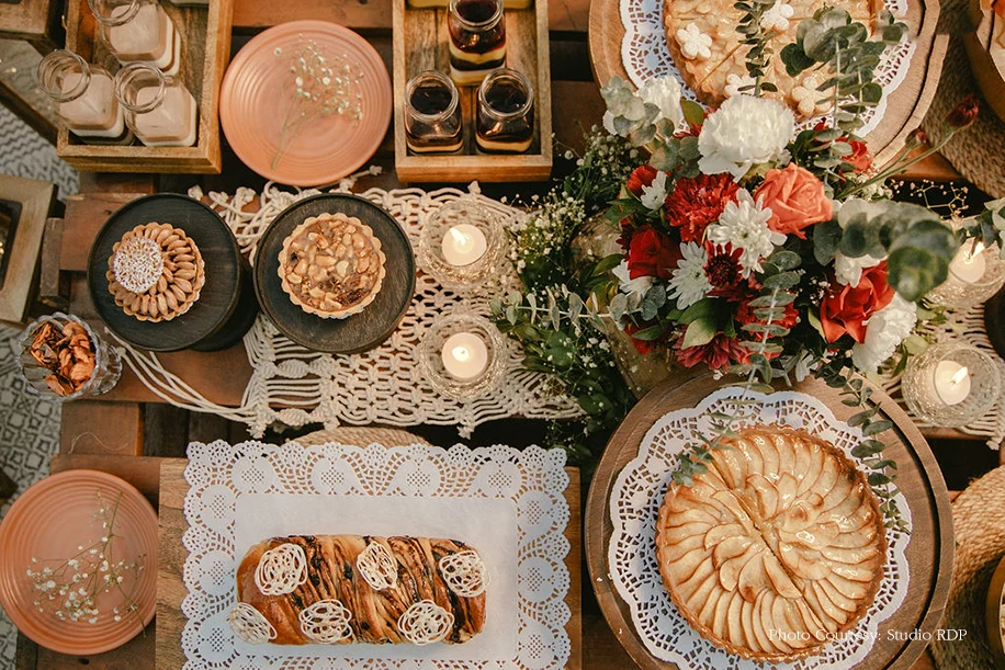 Additionally, taking their affinity for detail to a whole new level, it was also ensured that the wedding cake played a significant part in the shoot by following a bohemian theme. Giving us an insight into this decision Shruti shares, “Unlike traditional wedding cakes, bohemian wedding cakes have a more organic look and feel. Made by the skilled pastry chef at Hilton Goa Resort, this cake was an absolute stunner and was a dream come true! Seated on a rustic wooden stand, the three-tier cake was stunningly beautiful as it was adorned with flowers, herbs, and leaves that went in perfect sync with the theme of the shoot.”