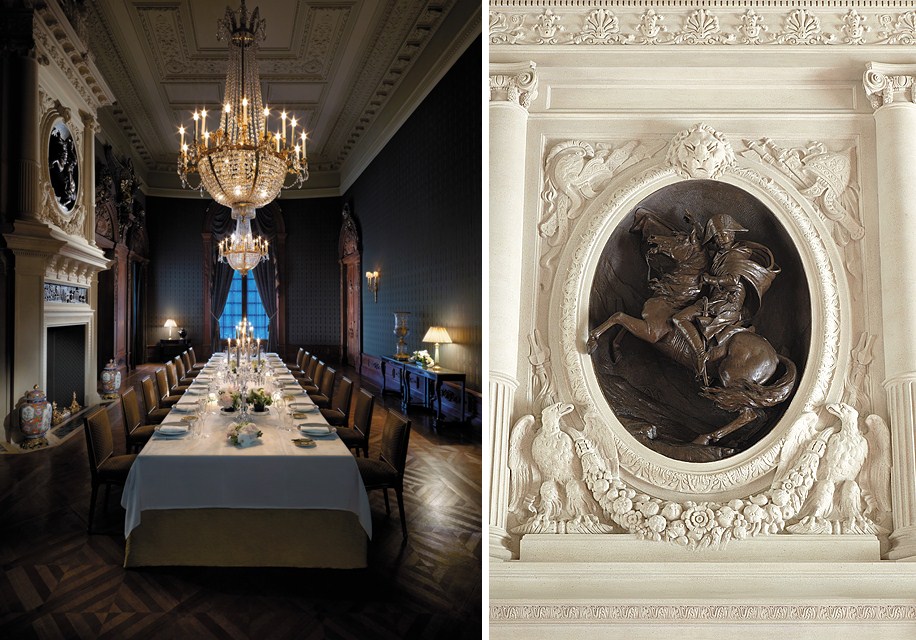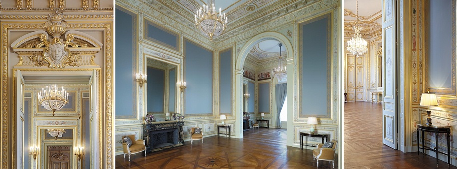 Originally built in 1896, this palace is the former residence of French imperial Prince Roland Bonaparte. The prince commissioned architect Ernest Janty, renowned for his reconstruction work of the Louvre and Tuileries palaces for Napoleon III, to design an elegant home and reception areas in order to receive notable guests. The palace’s façade is inspired by the Louis XIV style, with intricate masonry of stone from L’Oise. Sculptors Steiner and Houguenade, who also rose to fame for their craftsmanship on the Louvre and the Tuileries Palaces, were commissioned to carve the façade’s “eclectic style,” featuring the family’s coat of arms, lion heads and antlers.
