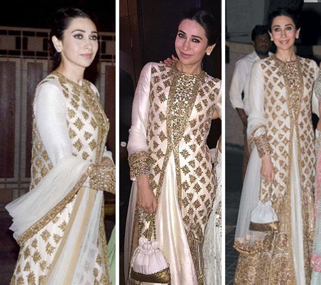 Karisma Kapoor in a gorgeous white and gold embroidered lehenga and long jacket set by Manish Malhotra