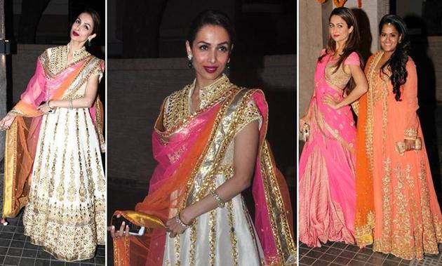 Malaika wore a cream and gold Preeti S Kapoor floor-length anarkali while her sister Amrita Arora wore a Shantanu Nikhil lehenga in hot pink
