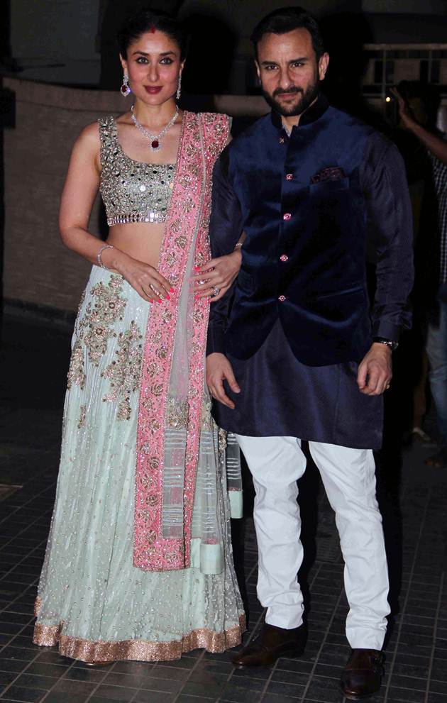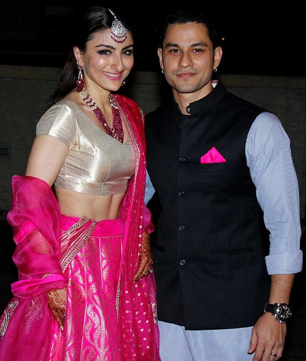 After their low-key marriage on the morning of January 25, Soha Ali Khan and Kunal Khemu hosted a reception for their close friends from the industry. Soha wore a hot pink and gold lehenga designed by Sanjay Garg (Raw Mango) from his Winter Festives 2014 collection. Kunal Khemu accessorised his traditional ensemble with pink pocket square to match his beautiful bride.