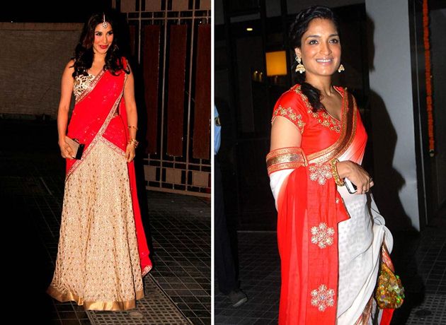 Sophie Choudry in a red and gold lehenga by Anushka Khanna and Sandhya Mridul in a beige and orange saree by Nikasha Tawadey