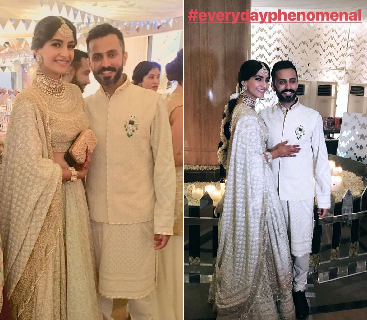 Sonam Kapoor wore a panelled chikankari ivory and pastel lehenga covered in intricate chikankari detail, embellished with accents of light gold by Abu Jani Sandeep Khosla and jewellery by her mom, Sunita Kapoor. The lehenga, highlighted in gold and silver zardozi, zari, pearls, Swarovski crystals and tiny sequins, took over 18 months to come to life!