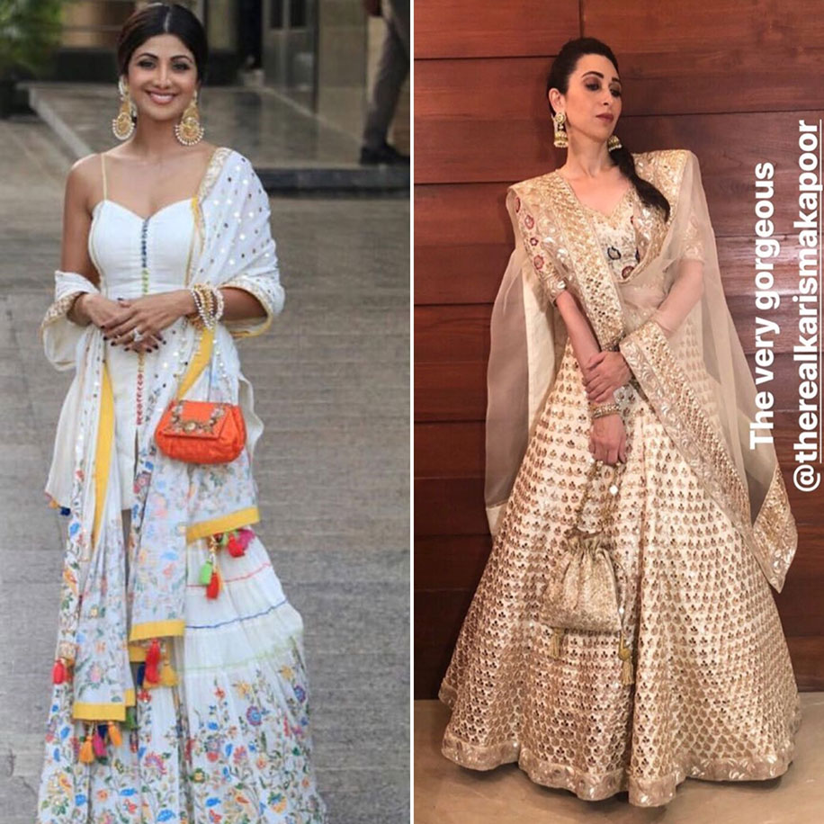 Shilpa Shetty brought a hint of color to her ensemble by Sukriti Akriti and jewellery by Amrapali. Karisma Kapoor nailed it in a Manish Malhotra lehenga.